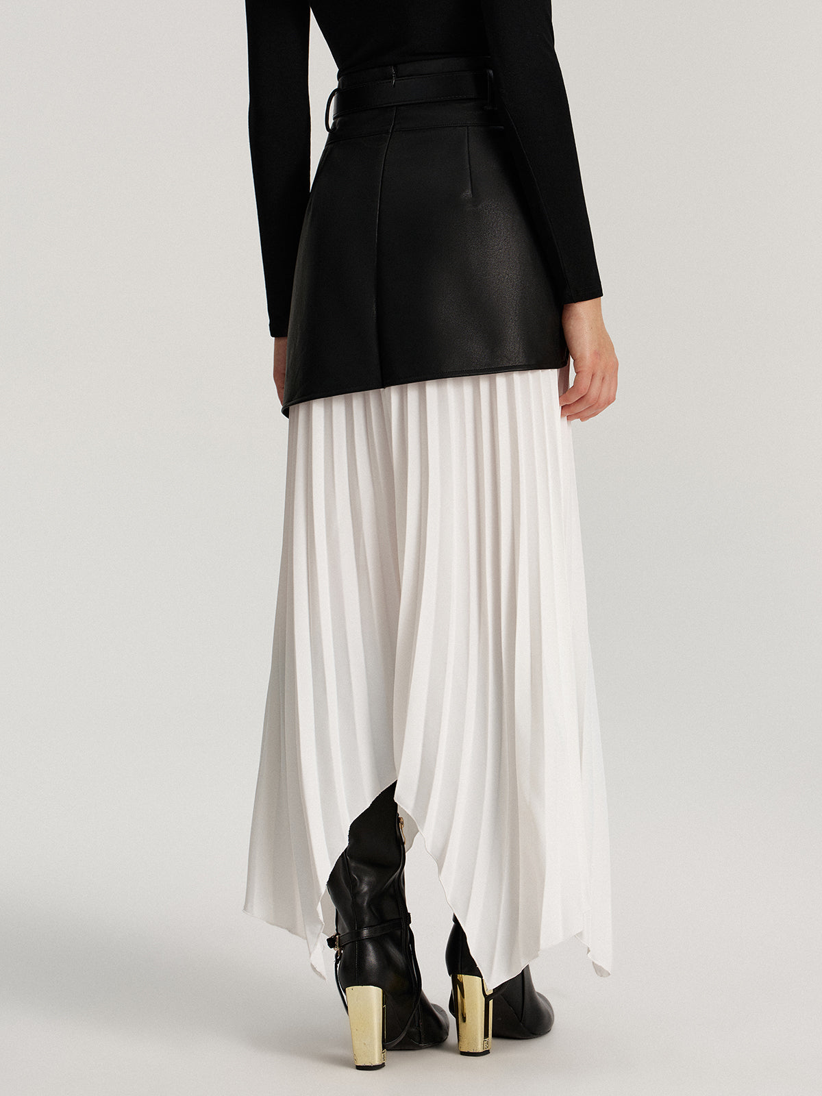 Belted Asymmetric Faux Leather Panel Pleated Maxi Skirt