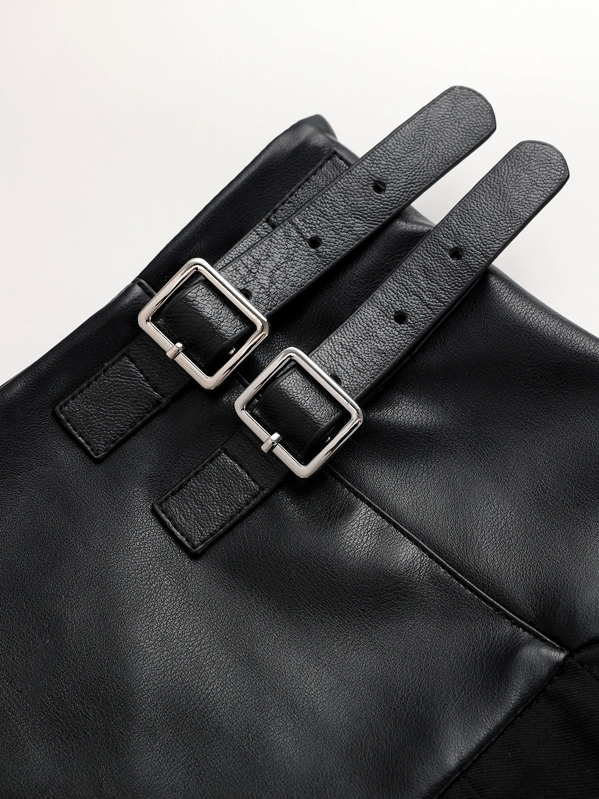 Buckle Detail Faux Leather Panel Pleated Midi Skirt