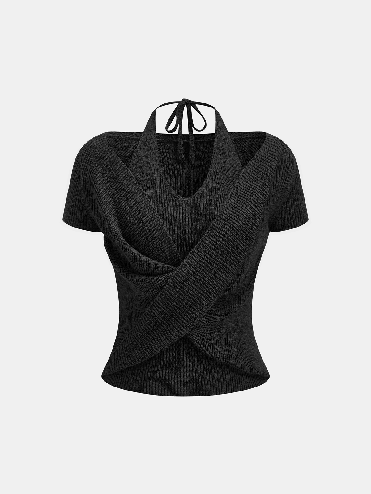 black,casual,clothing,coll:knitwear,coll:sweater_tops,coll:sweaters_cardigans,coll:tops,coll:trending,corpcore,cross wrap,halter,in_six_month,khaki,knit,knit tops,knitwear,minegence,mwt,mwt-ss,not_low_sales,oa251204023,regular fit,slight stretch,thin,tied&knot,women