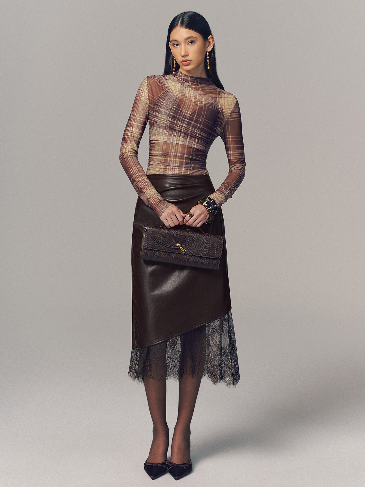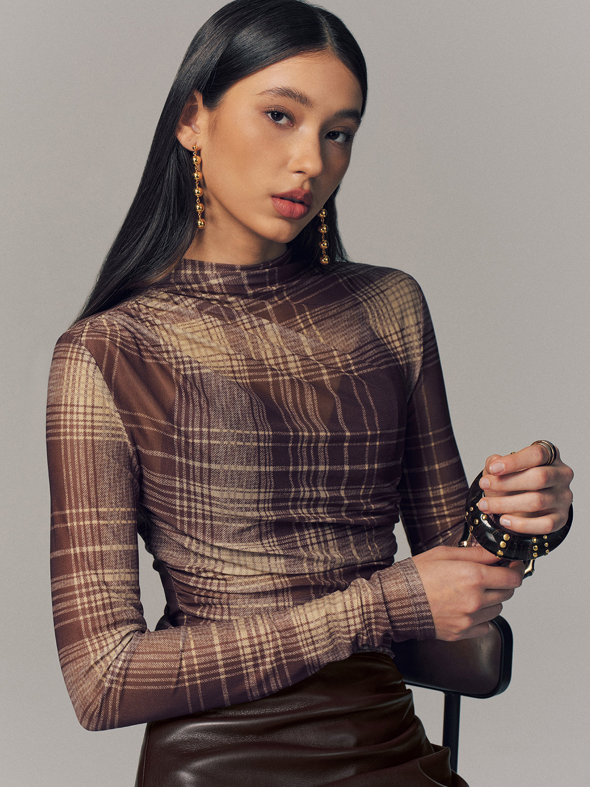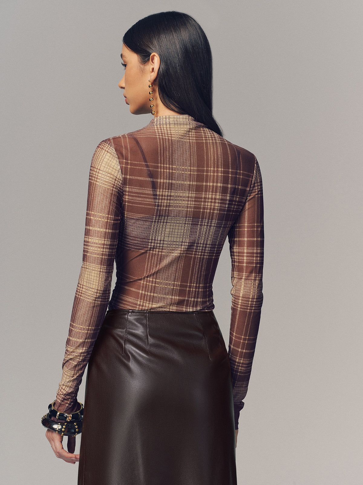 basic - fabric,brown,casual,cici select,clothing,coll:plaids_polka,coll:tops,crew neck,date,fall,high stretch,in_six_month,long sleeve,mesh,minegence,mwt,not_low_sales,oa251016026,photo_model,plaid,regular,regular fit,semi-sheer,spring,t-shirts,thin,tops,true_to_size,winter,winter hues,women