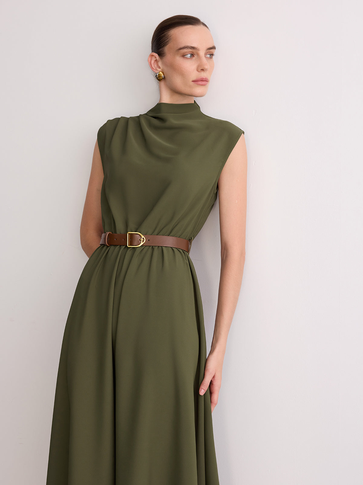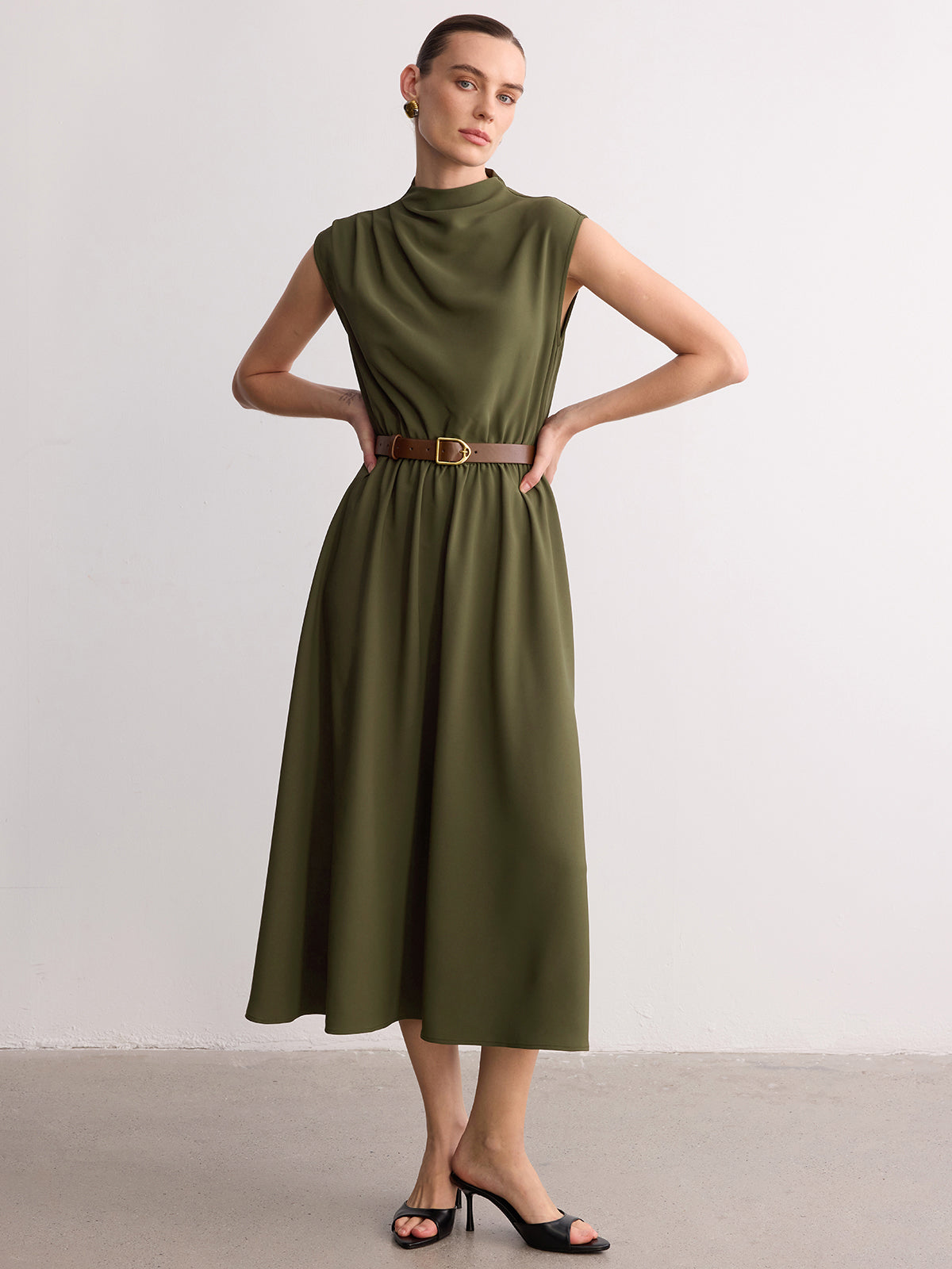 Sleeveless Mock Neck Belted Maxi Dress