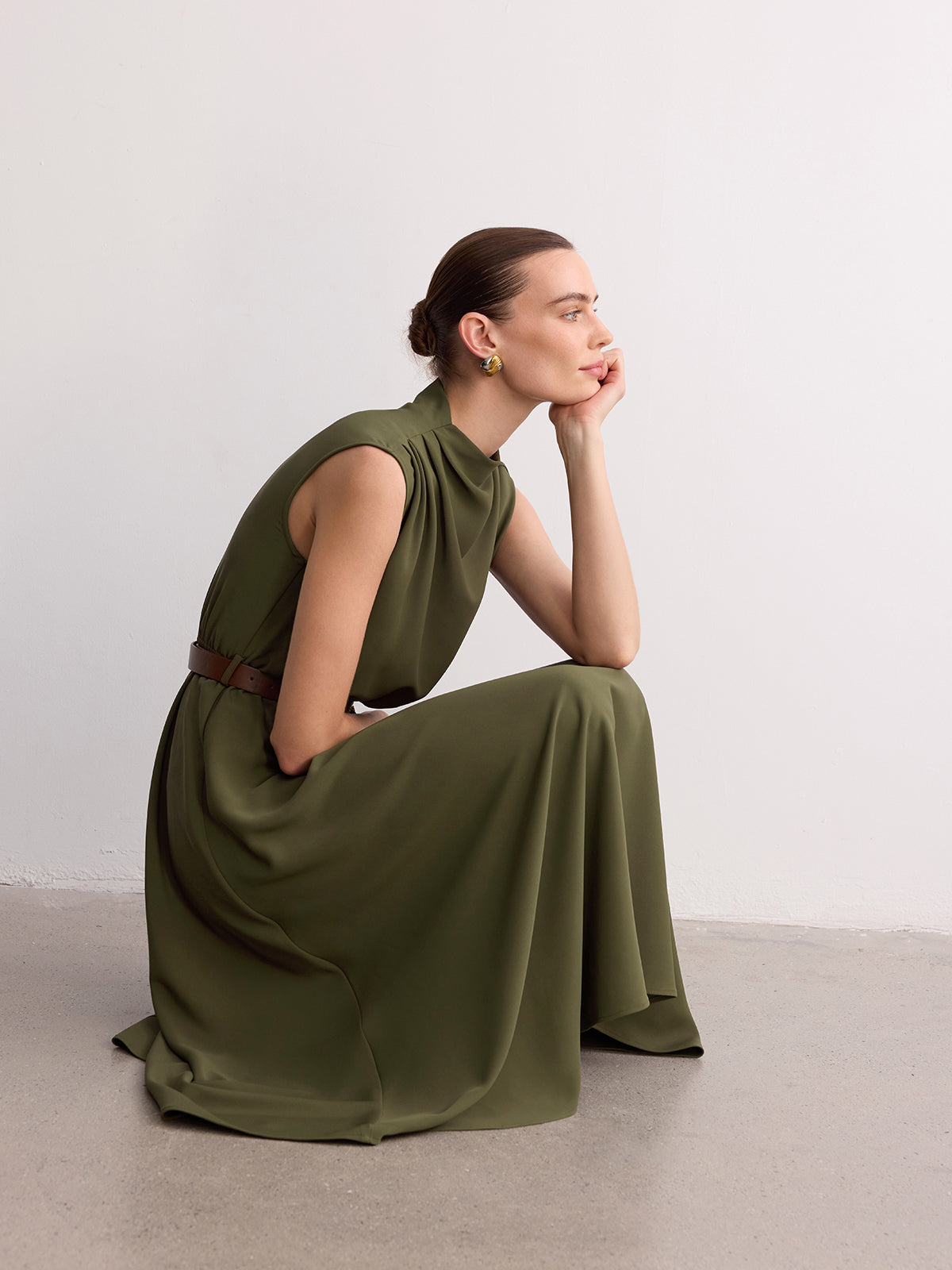 asymmetric,clothing,coll:dresses,corpcore,date,dresses,green,in_six_month,maxi,minegence,no,non-stretch,not_low_sales,oa251113008,photo_model,pleated,regular,regular fit,sleeveless,stand collar,umbrella hem,women,woven fabric
