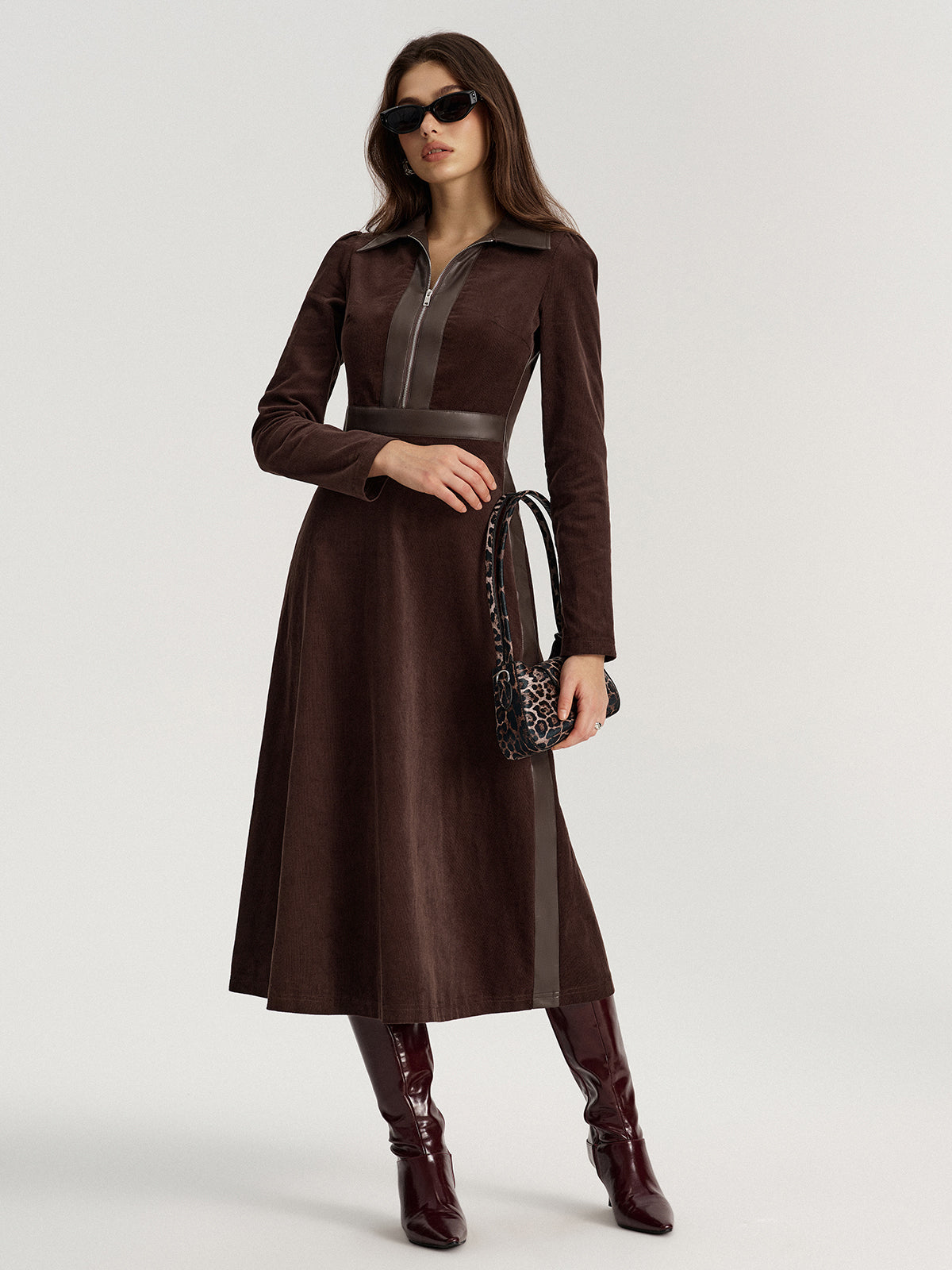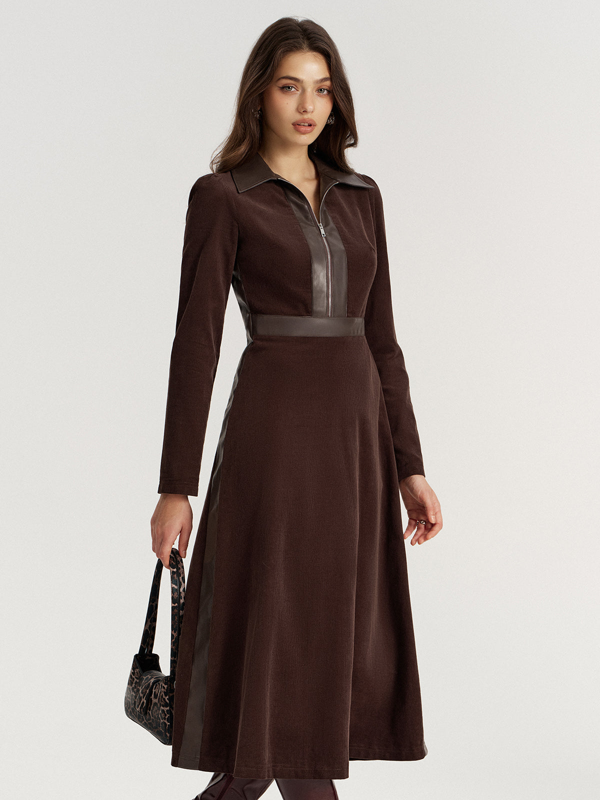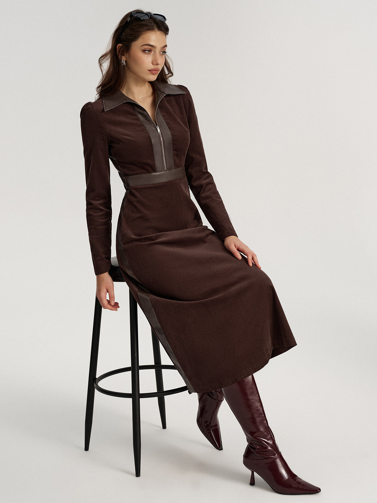 a-none,casual,clothing,coll:dresses,coll:old_money,coll:vintage_fabrics,collar,corduroy,corpcore,dark brown,dresses,fall,faux leather,in_six_month,inner sample,long sleeve,midi,minegence,no,non-stretch,not_low_sales,oa250928047,photo_model,regular,regular fit,spring,winter,women