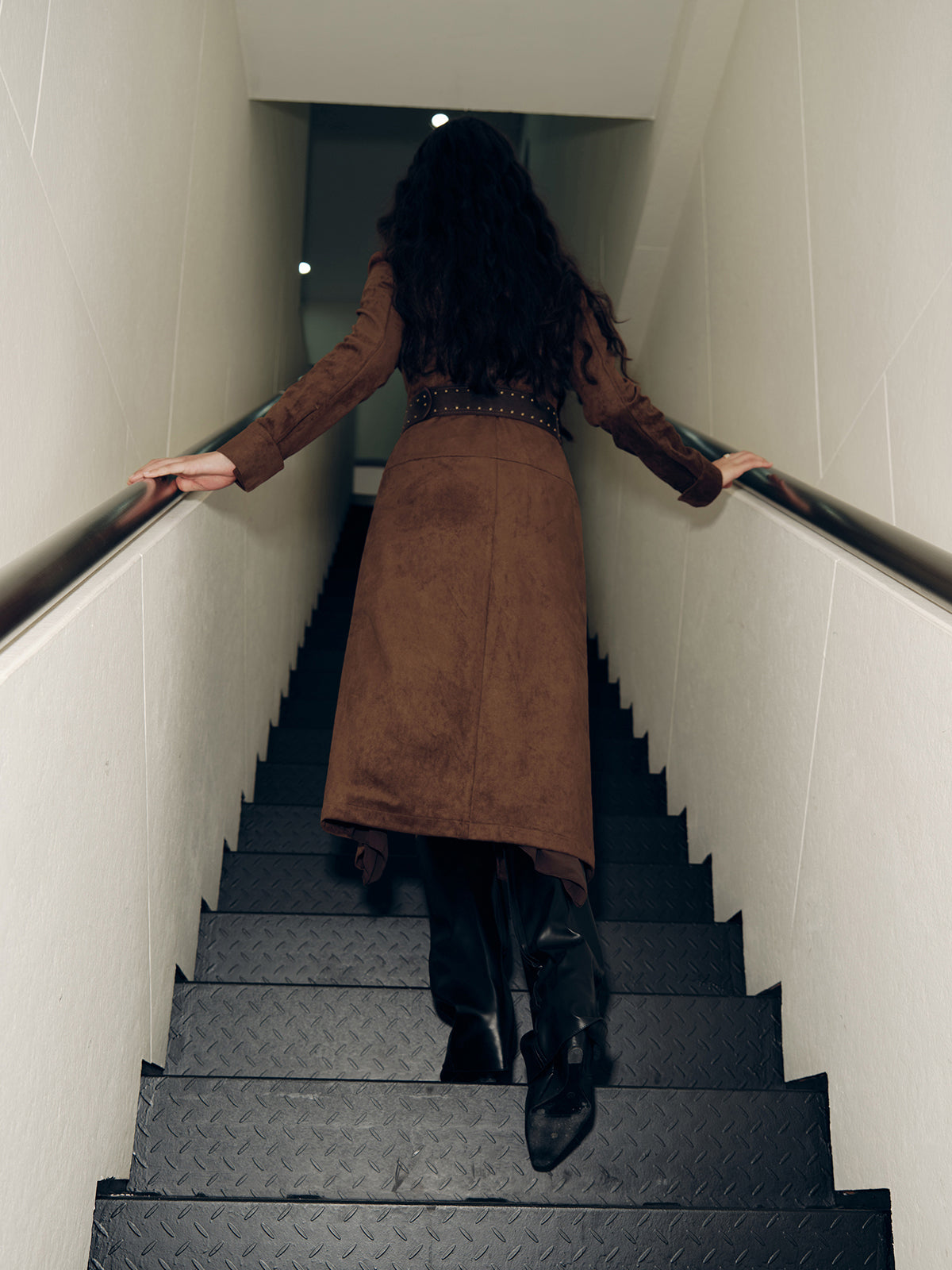 a-none,clothing,coll:dresses,coll:trending,coll:vintage_fabrics,collar,dark brown,dresses,fall,in_six_month,inner sample,long sleeve,midi,minegence,no,not_low_sales,oa250819051,photo_model,regular,slight stretch,slim fit,suede effect,winter,women