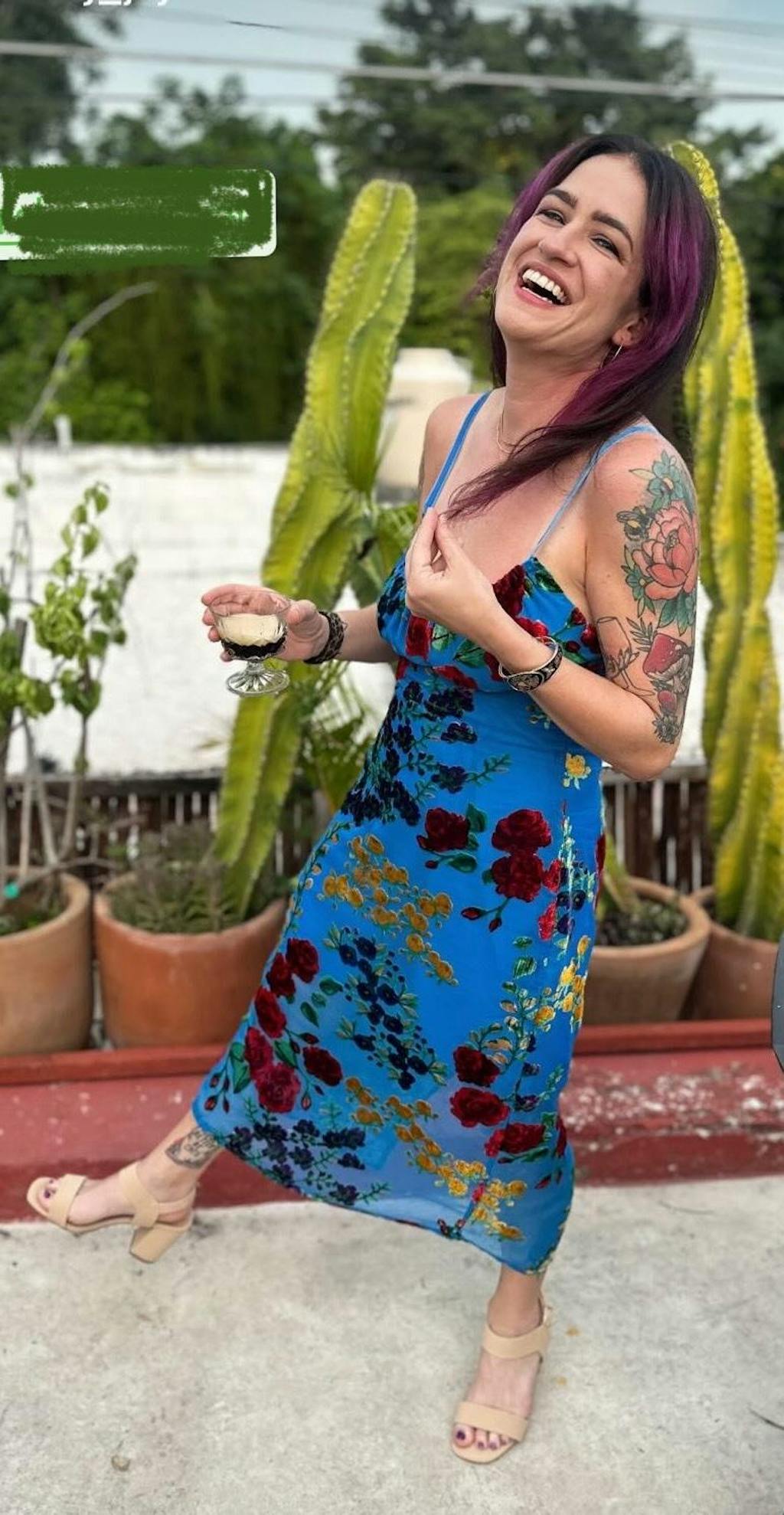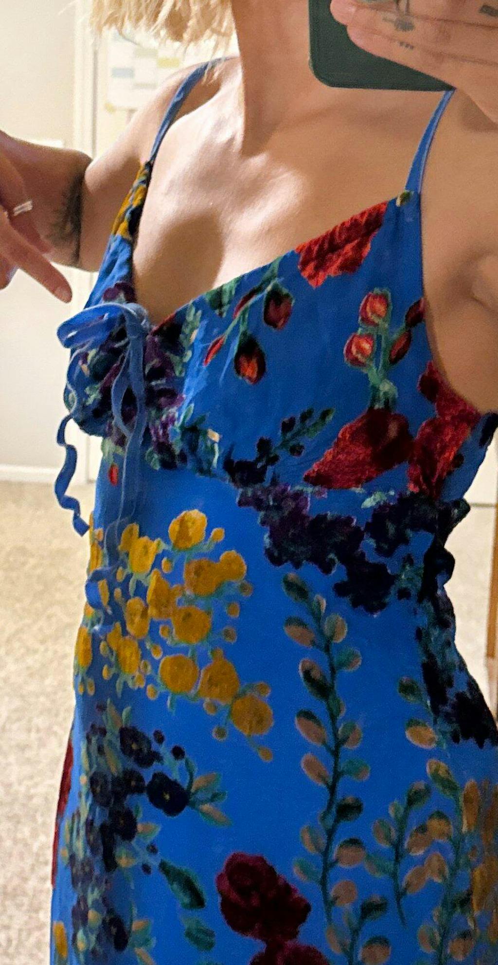 I love this dress!!!! It fits like a glove. The color is so beautiful and I love how the velvet flowers pop. This dress also works well without a bra, as the bodice is adjustable with the drawstring. I’m a 34DD and had no problem going braless.