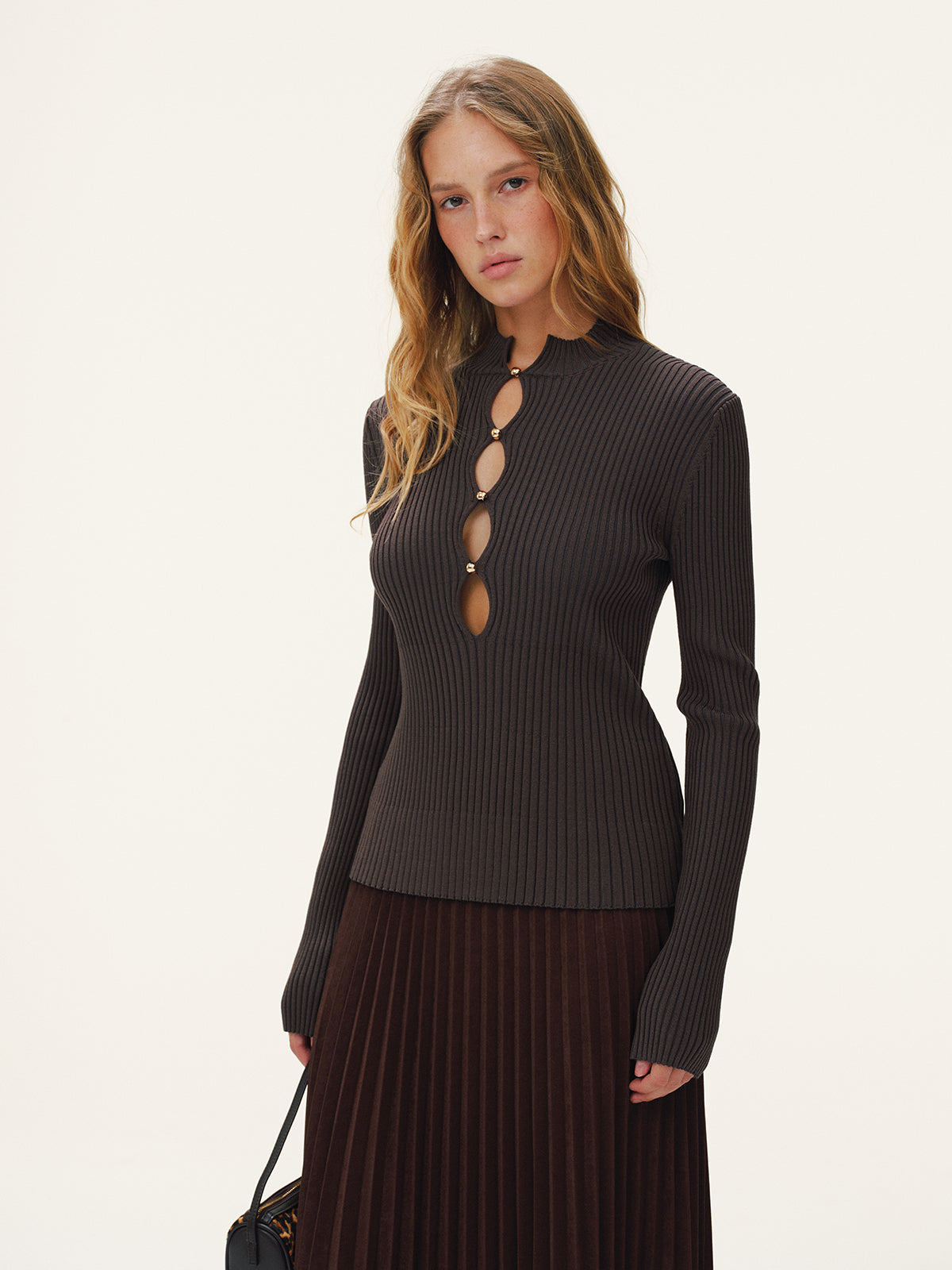 Metal Detail Cut-Out Mock Neck Fitted Sweater