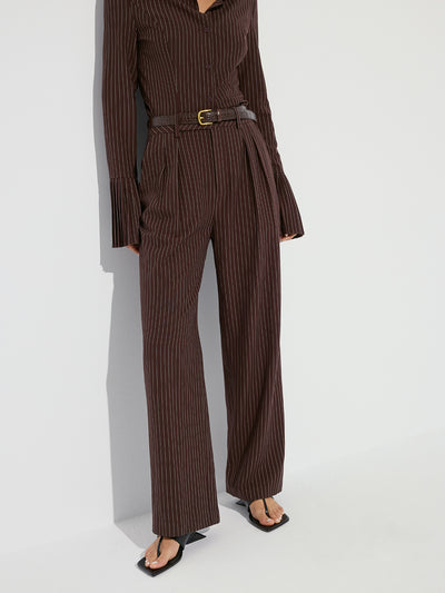 Striped Pleated Wide-Leg Pants without Belt