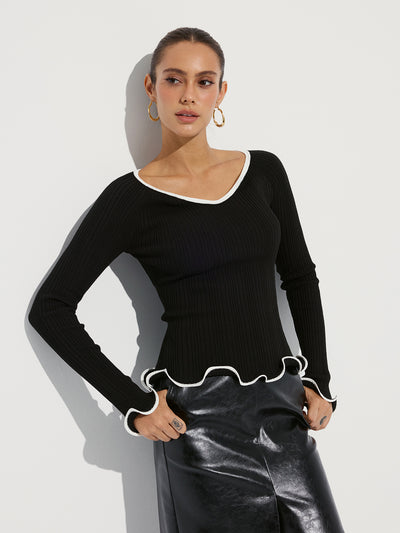 Contrast Ruffle Trim Ribbed Knit Top