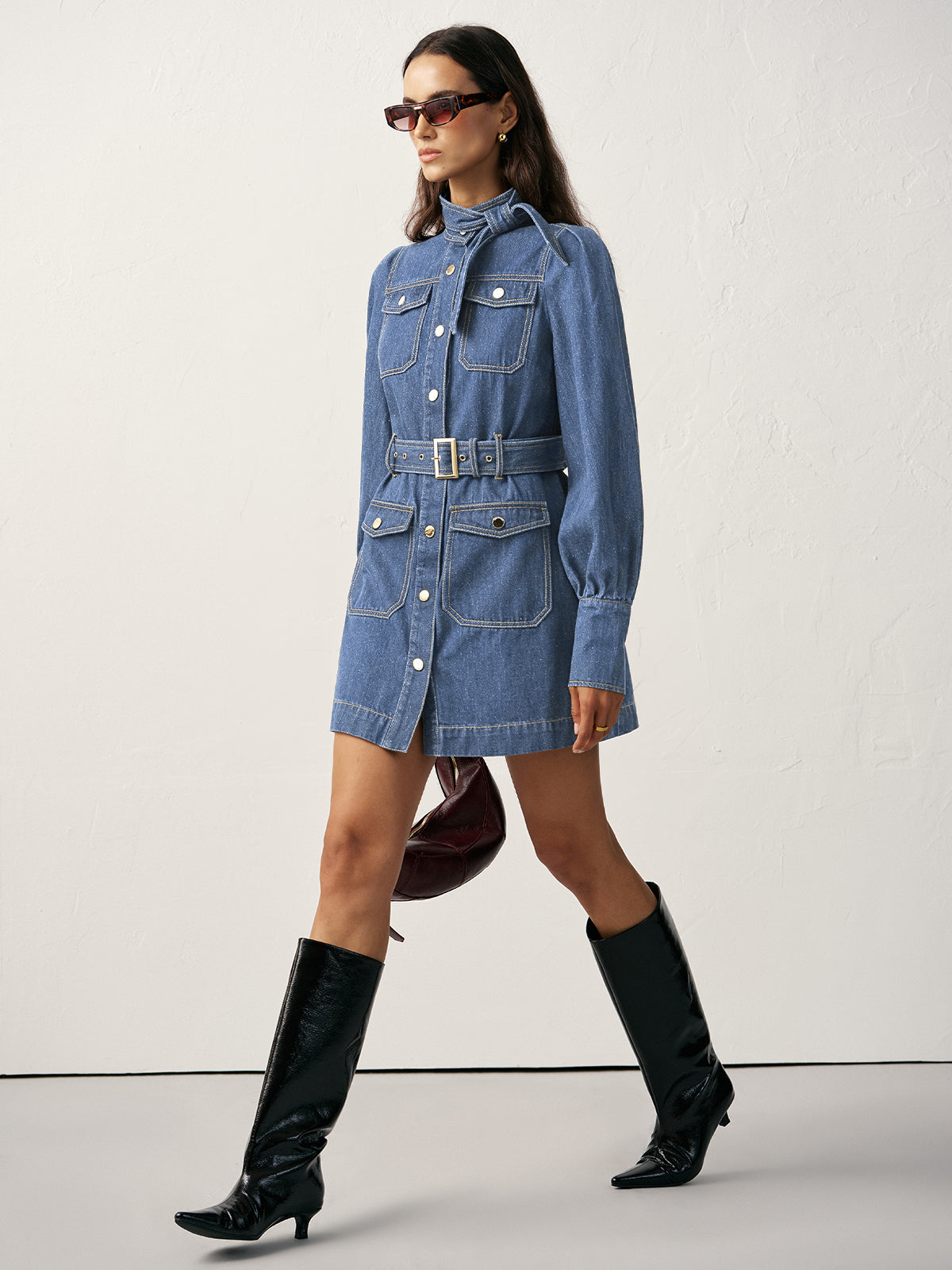 belted,blue,casual,cathryn-d,clothing,coll:denim,coll:dresses,cyy,daily,denim,denim dresses,dresses,fall,in_six_month,inner sample,lightblue,long sleeve,metal detail,new work outfit,no,not_low_sales,oa250711009,photo_model,regular,regular fit,serena-选品,short,slight stretch,stand collar,winter,women
