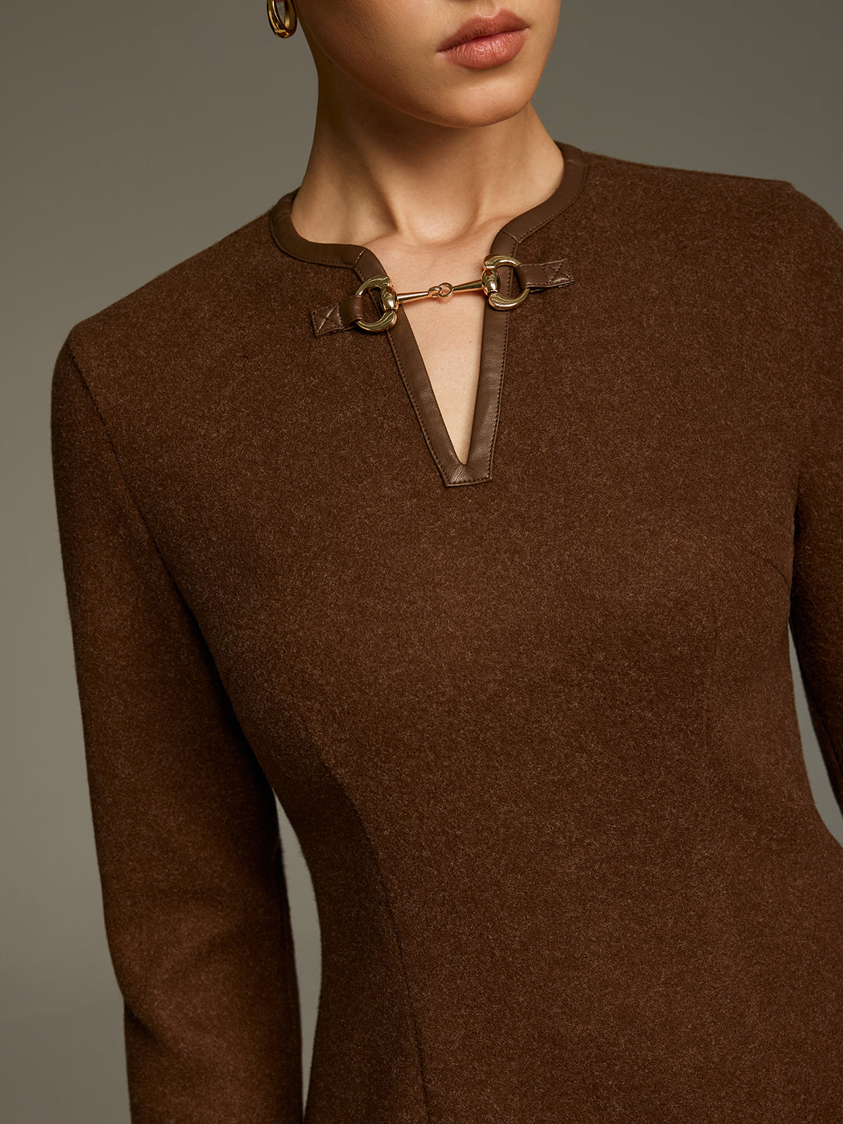casual,clothing,coll:dresses,corpcore,dark brown,dresses,fall,final clearance,in_six_month,invisible zipper,long sleeve,metal detail,minegence,no,not_low_sales,oa251105058,photo_model,regular,regular fit,short,slight stretch,v-neck,winter,women,woven fabric