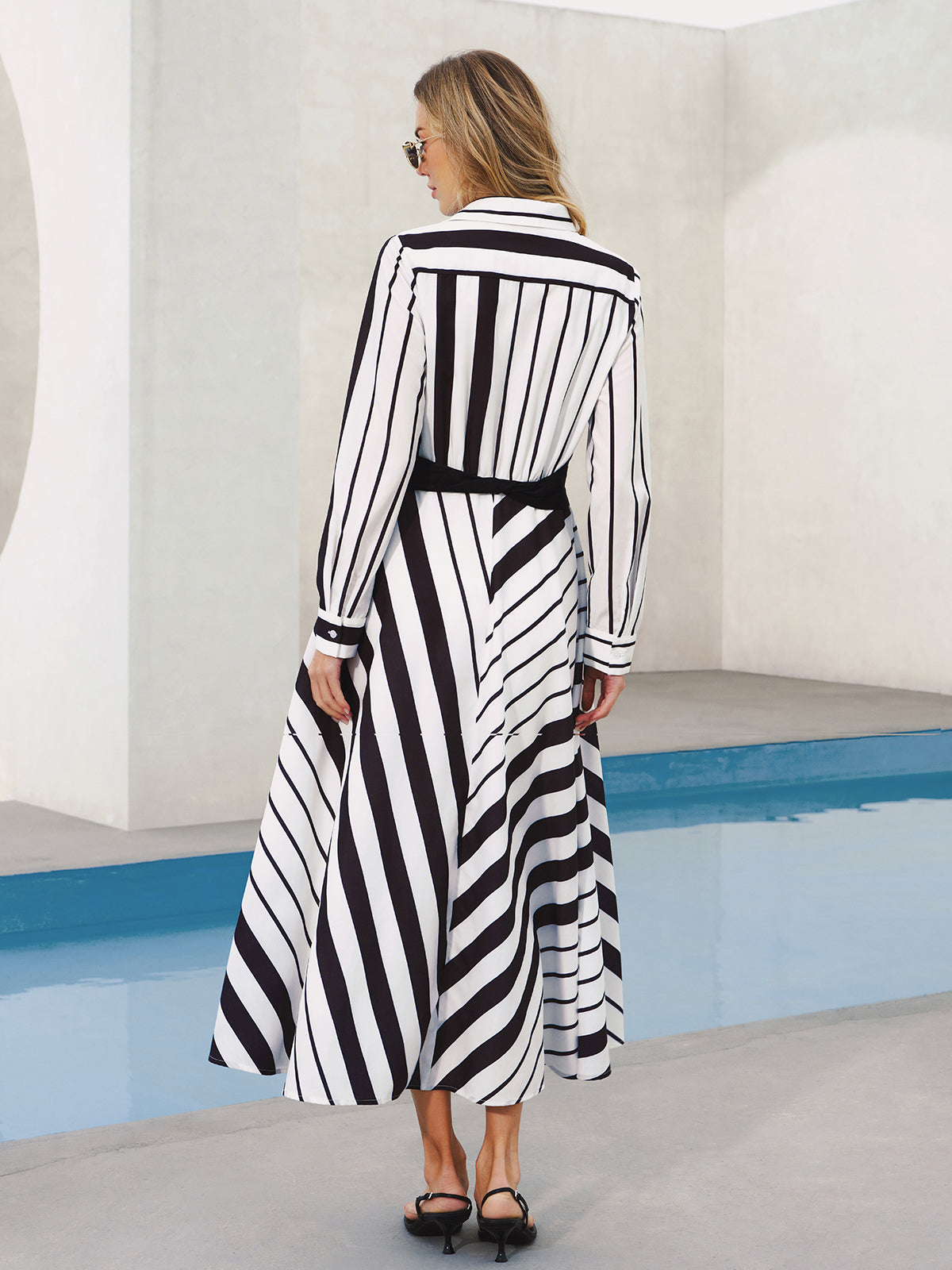 belted,blackandwhite,casual,clothing,coll:dresses,collar,corpcore,dresses,in_six_month,long sleeve,midi,minegence,no,non-stretch,not_low_sales,oa251223042,off-shore collective,photo_model,regular,regular fit,stripe,umbrella hem,women,woven fabric