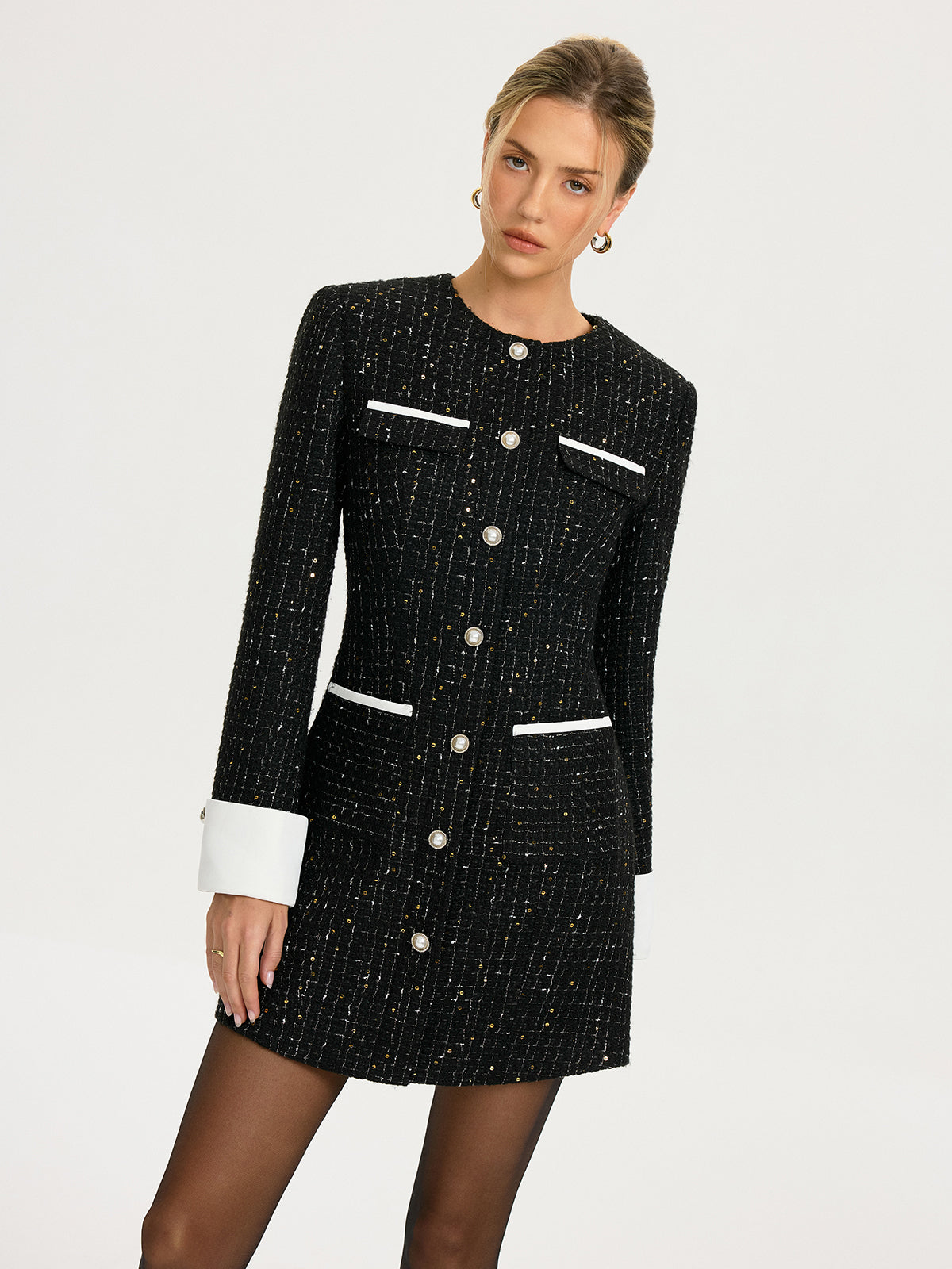 black,clothing,coll:dresses,coll:vintage_fabrics,collar,corpcore,date,dresses,feminine,in_six_month,invisible zipper,long sleeve,metal detail,no,non-stretch,not_low_sales,oa251107048,patchwork,photo_model,regular,regular fit,short,tweed,women