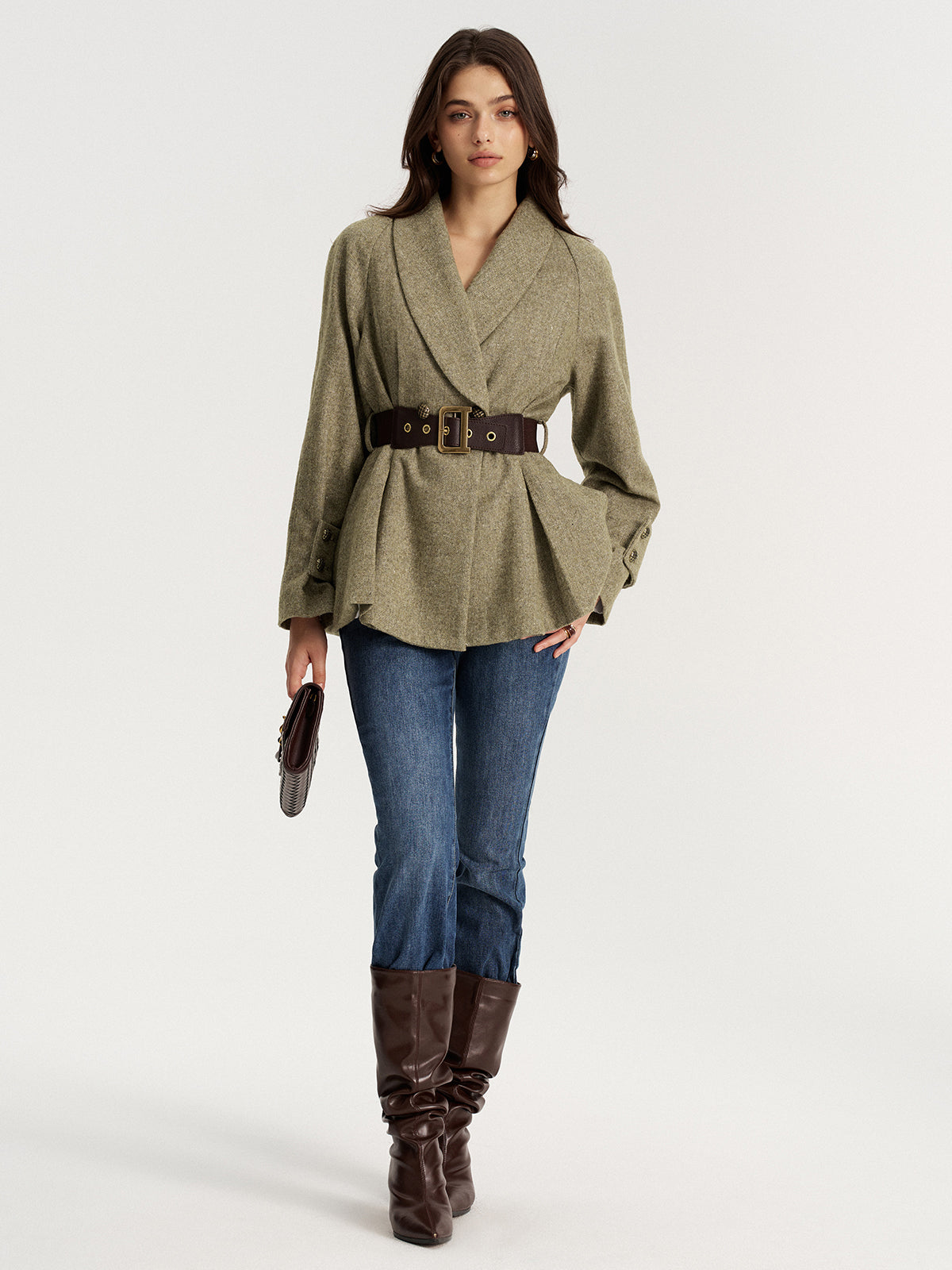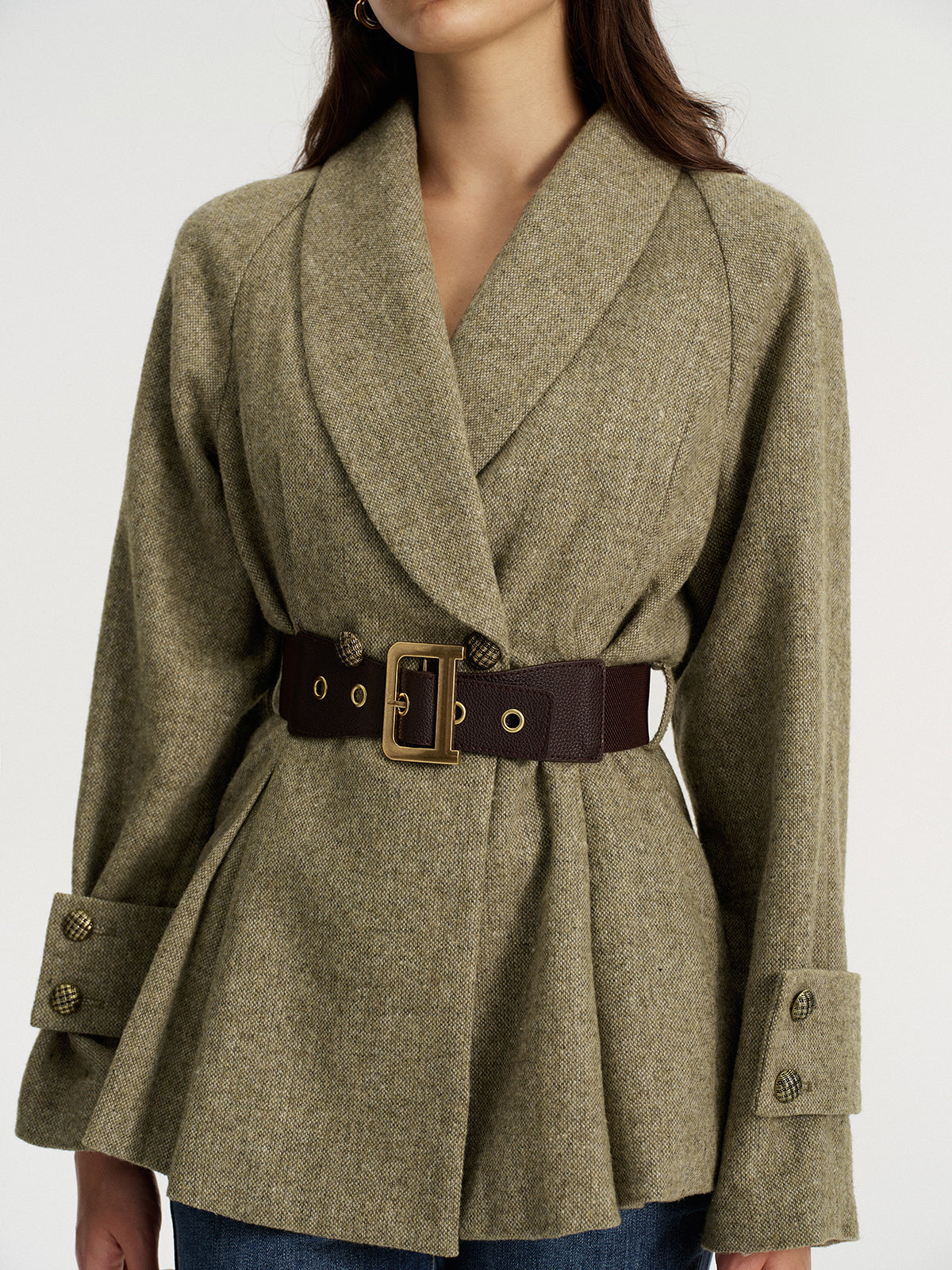 basic - fabric,belted,blazers,clothing,coll:blazers,coll:outerwear,coll:tops,coll:trending,coll:vintage_fabrics,corpcore,date,fall,green,in_six_month,inner sample,long sleeve,metal detail,minegence,mwt,non-stretch,not_low_sales,oa250929018,outerwear,photo_model,regular,slim fit,spring,tweed,warm,winter,winter hues,women