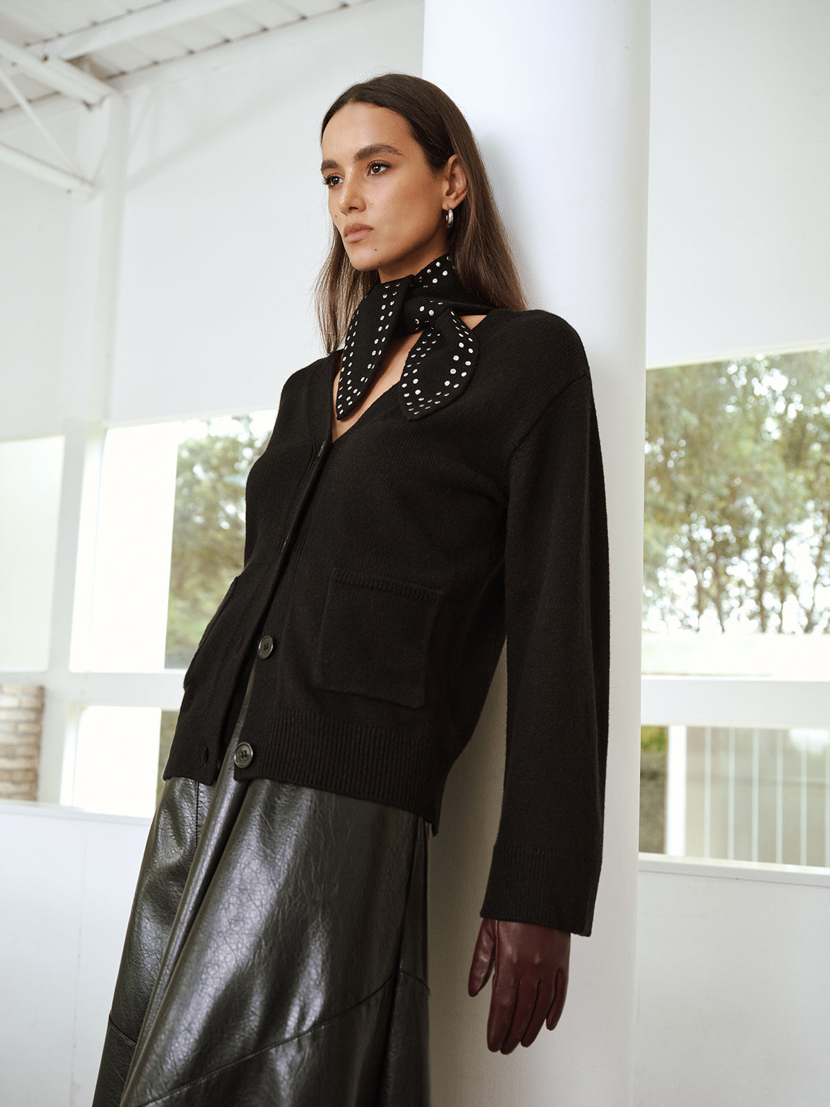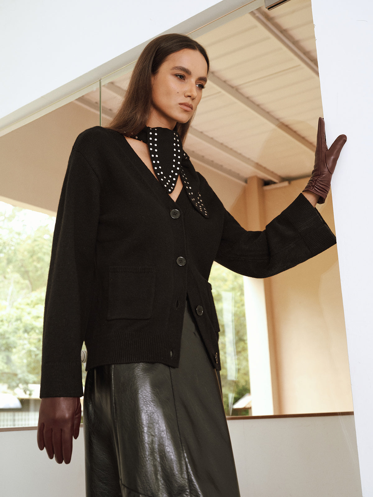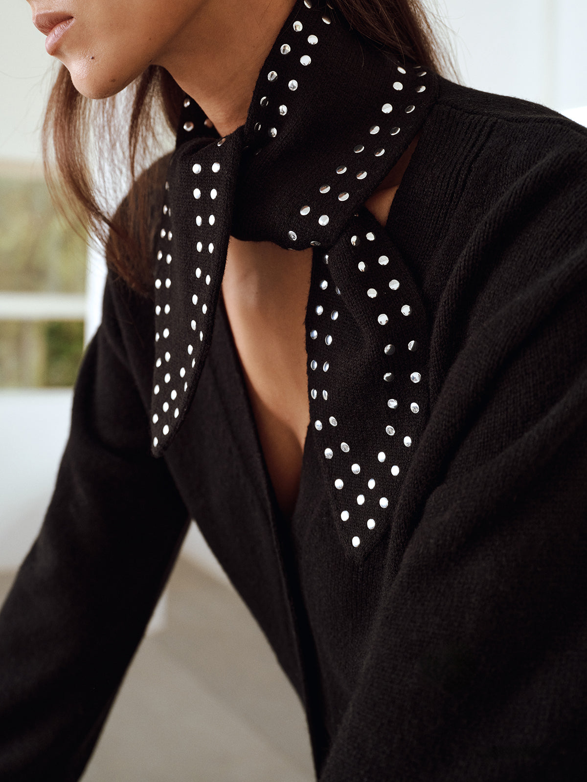 Wool Blend V-Neck Cardigan with Studded Scarf