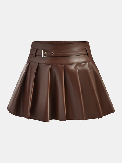 Belt-Decor Faux Leather Pleated Mini Skirt
