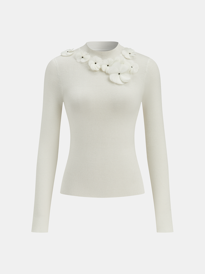 3D Floral Mock Neck Wool Blend Knit Top