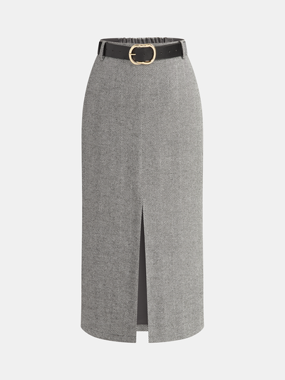 Belted Herringbone Slit Midi Skirt