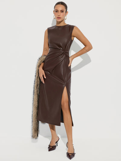 Twisted Faux Leather Sleeveless Slit Midi Dress