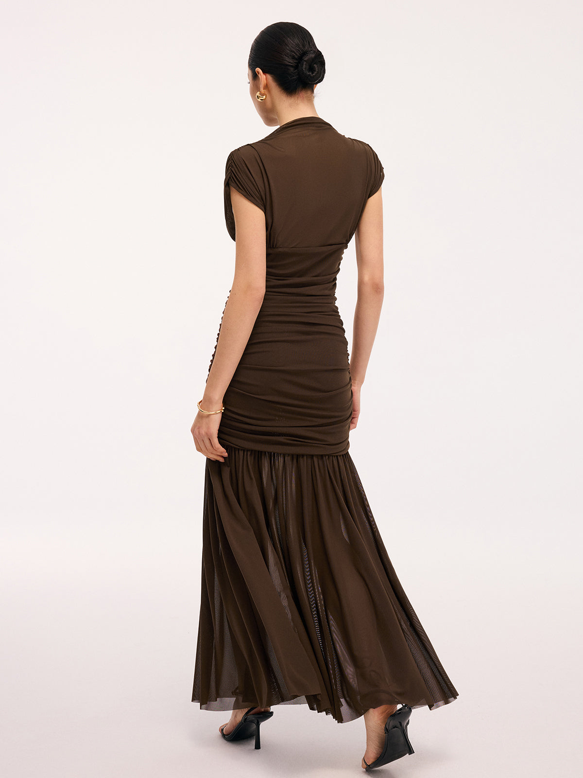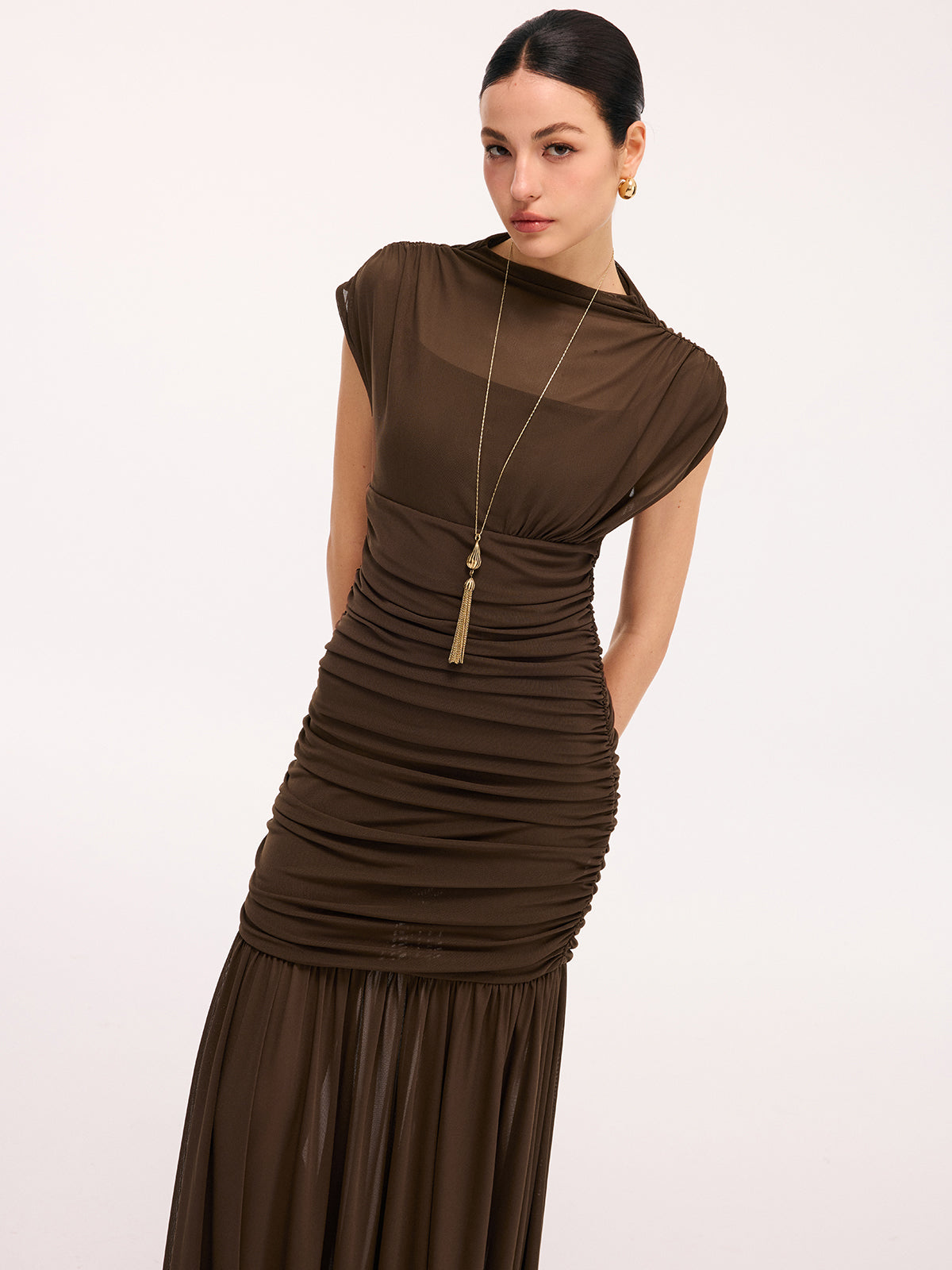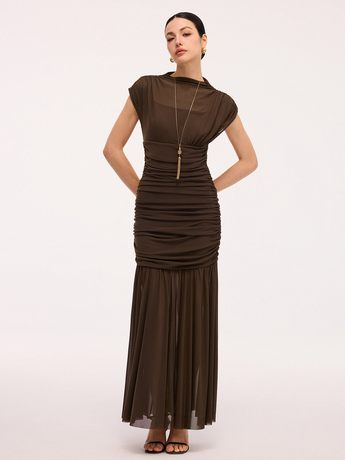 brown,clothing,coll:dresses,coll:sheer_bare-back,corpcore,crew neck,date,drape,dresses,feminine,in_six_month,maxi,medium stretch,mesh,not_low_sales,oa251127094,photo_model,regular,regular fit,ruched,season of love,semi-sheer,sheer,short sleeve,women