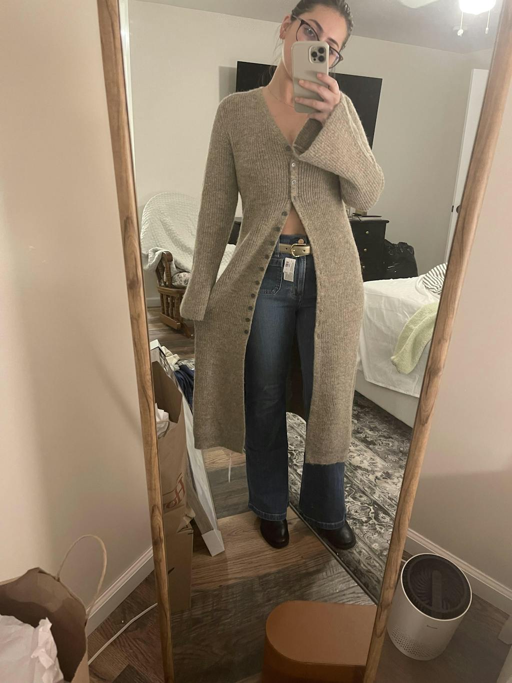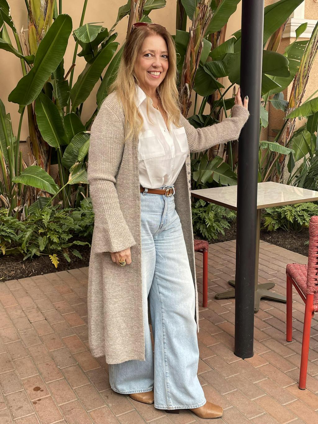 Great sweater jacket, the color is versatile. It is soft and slightly fuzzy. I bought a smaller sixes then recommended because of the stretch. I am large chested , but can wear it both buttoned or open.