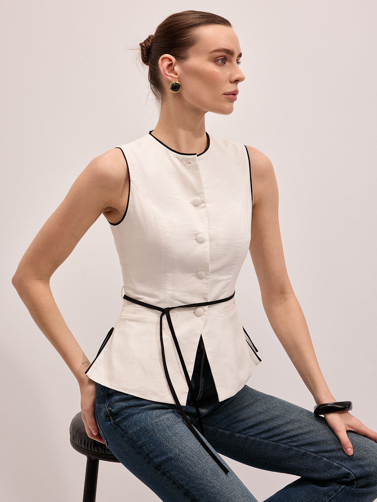 belted,casual,clothing,coll:linen_cotton,coll:matching_sets,coll:skirts,contrast piping / trim,corpcore,cotton&linen,crew neck,in_six_month,midi,minegence,non-stretch,not_low_sales,oa260119051,photo_model,regular,regular fit,sets,skirt sets,sleeveless,the linen ease,umbrella hem,white,women
