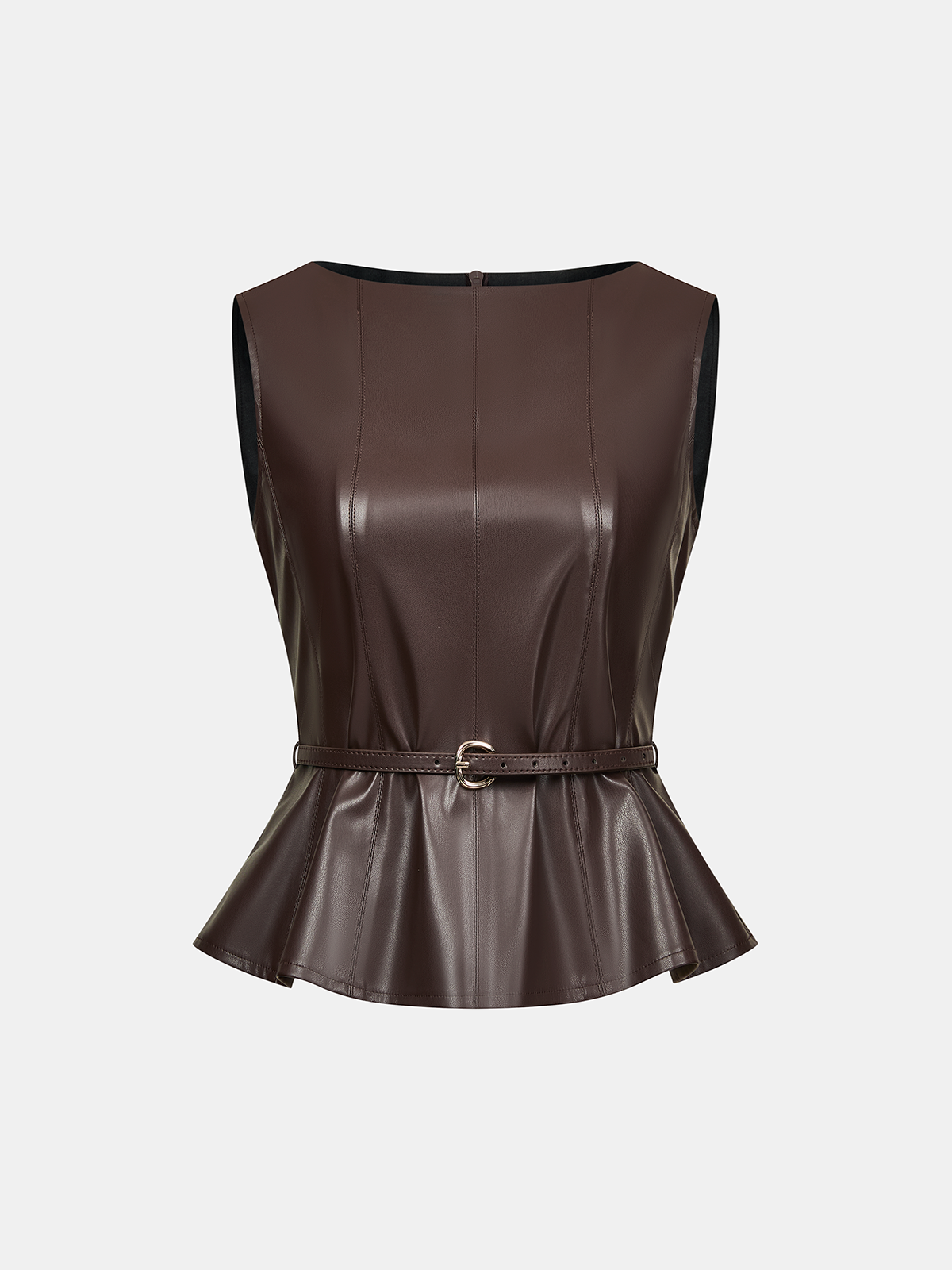 casual,clothing,coll:old_money,coll:tank_tops_camis,coll:tops,coll:vintage_fabrics,crew neck,dark brown,date,fall,faux leather,in_six_month,invisible zipper,minegence,no,non-stretch,not_low_sales,oa251112050,regular,ruffle,short top,sleeveless,slim fit,spring,tank tops & camis,tops,winter,winter hues,women