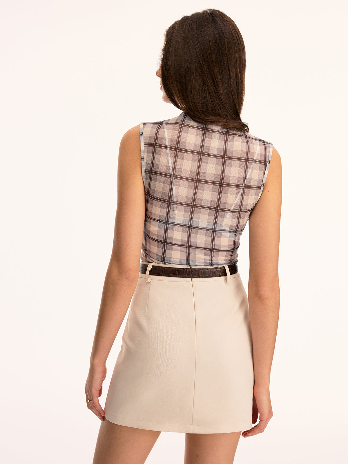 Plaid Sheer Mock Neck Sleeveless Tank Top