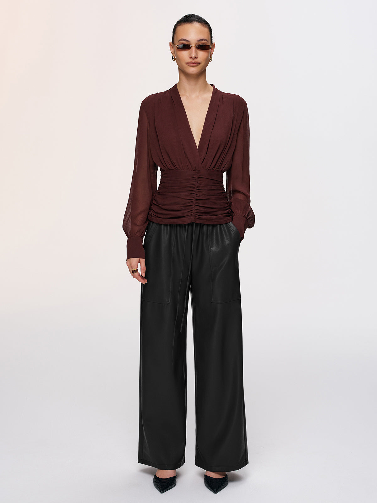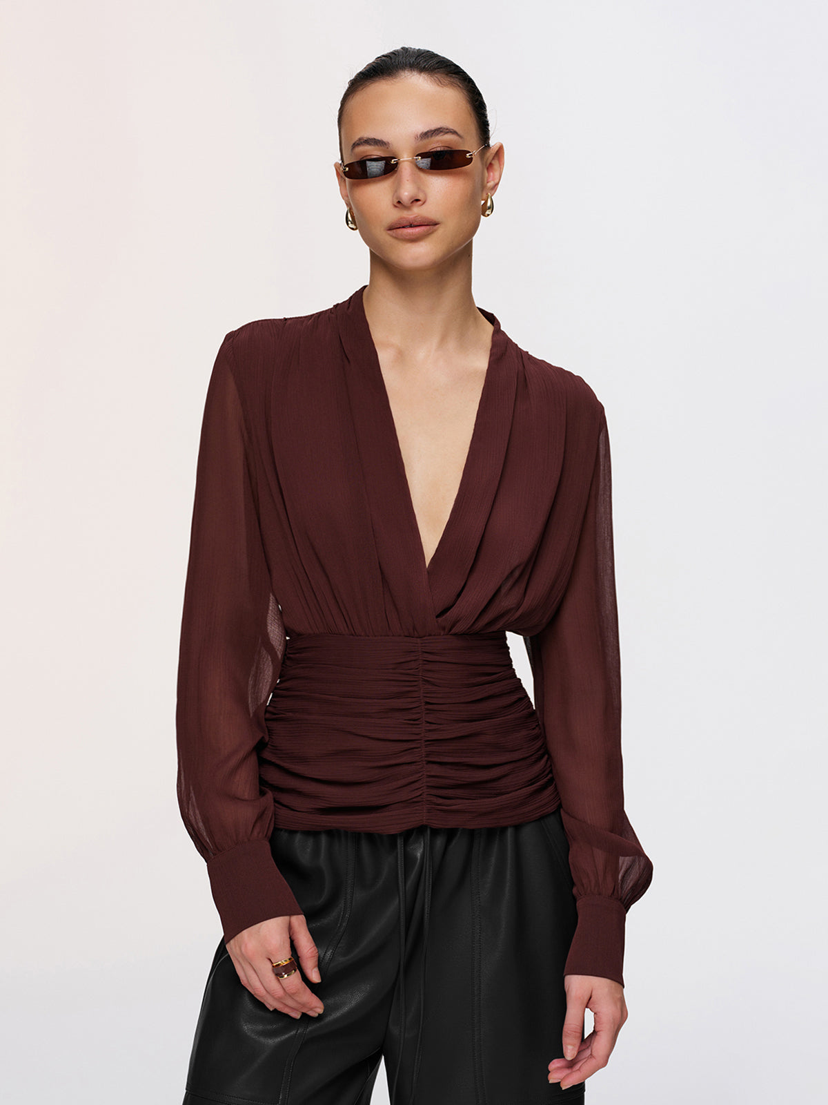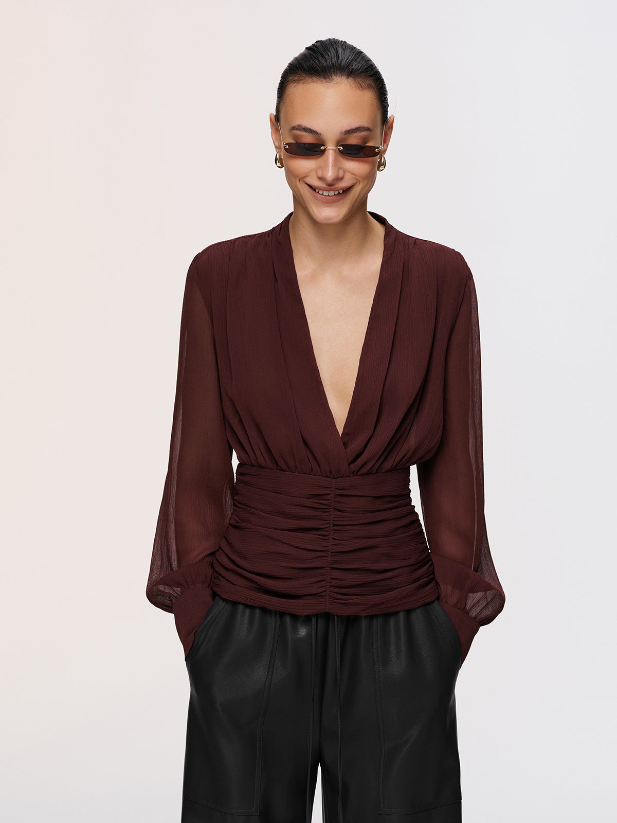 Semi-Sheer Ruched Deep V-Neck Blouse