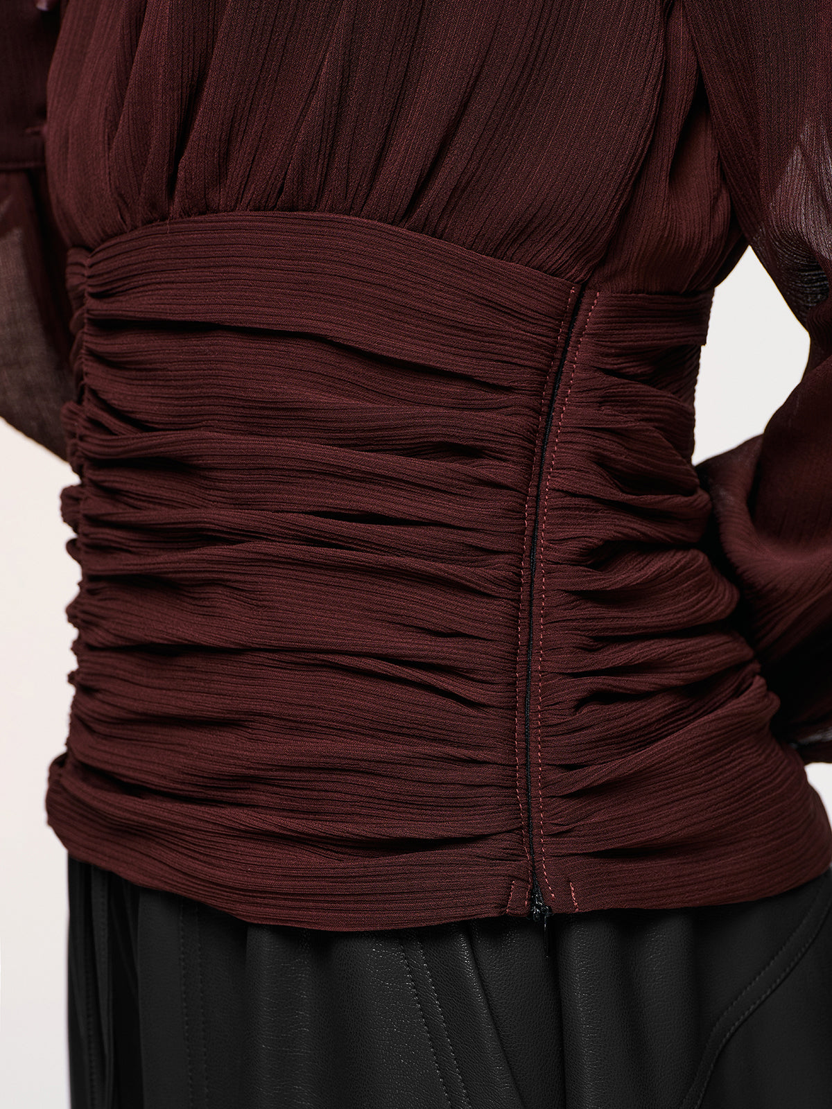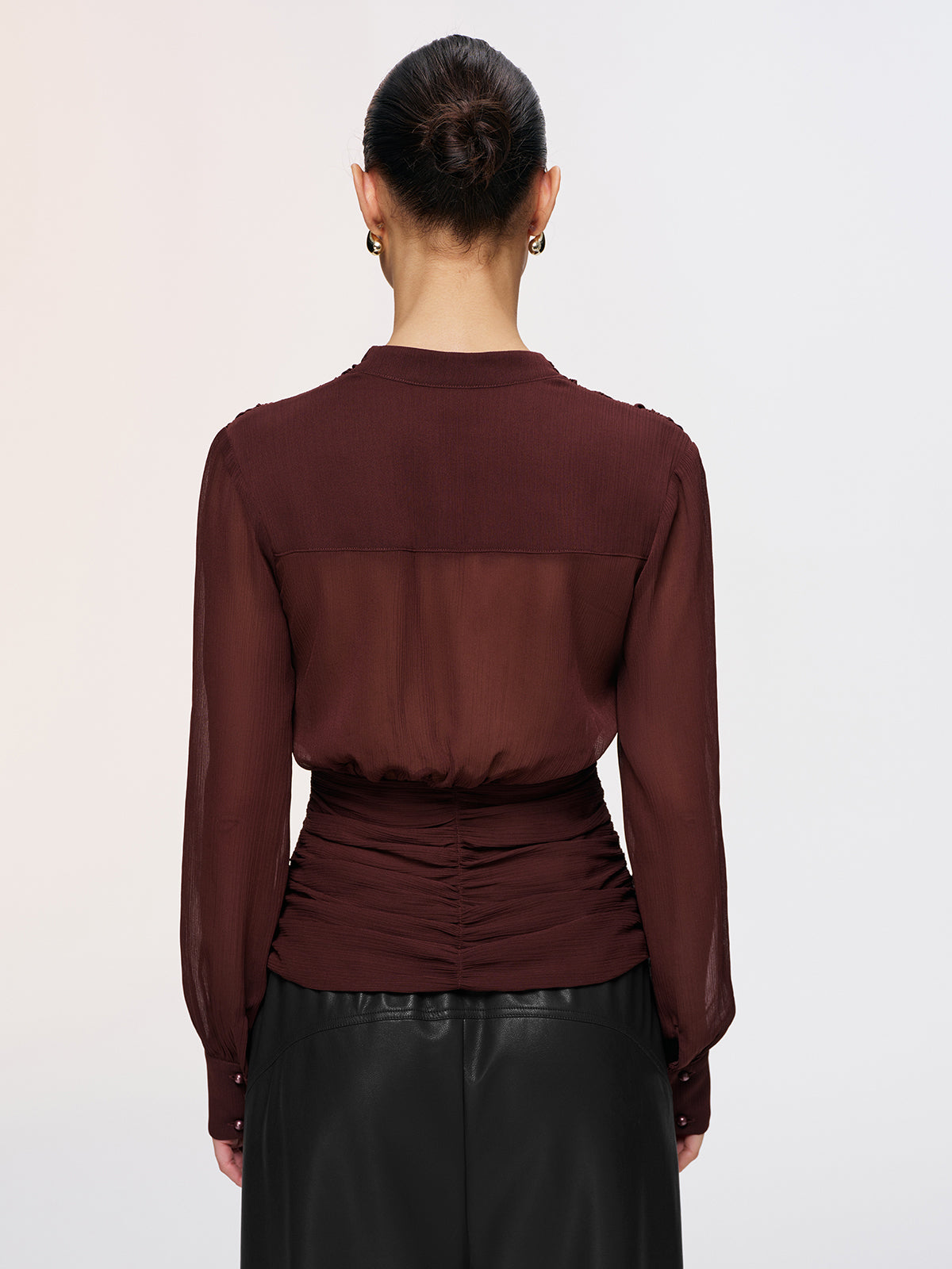 blouses,casual,chiffon,clothing,coll:blouses_shirts,coll:sheer_bare-back,coll:tops,corpcore,cross-over collar,dark brown,feminine,in_six_month,long sleeve,non-stretch,not_low_sales,oa251125074,photo_model,regular,regular fit,ruched,semi-sheer,sheer,tops,women