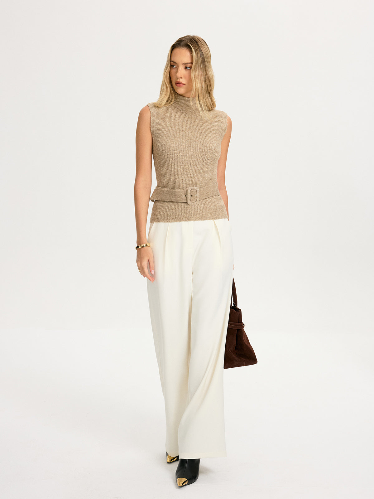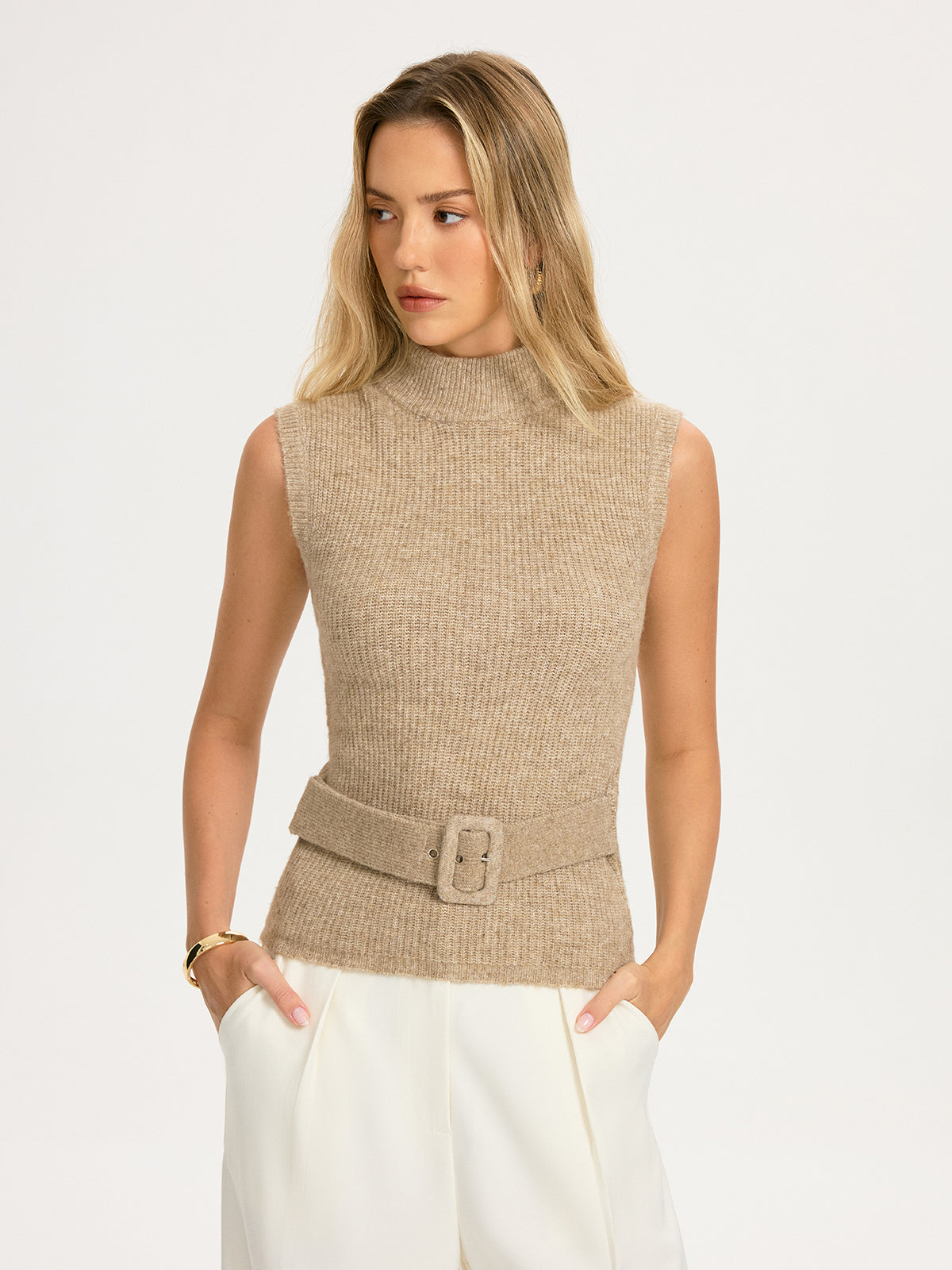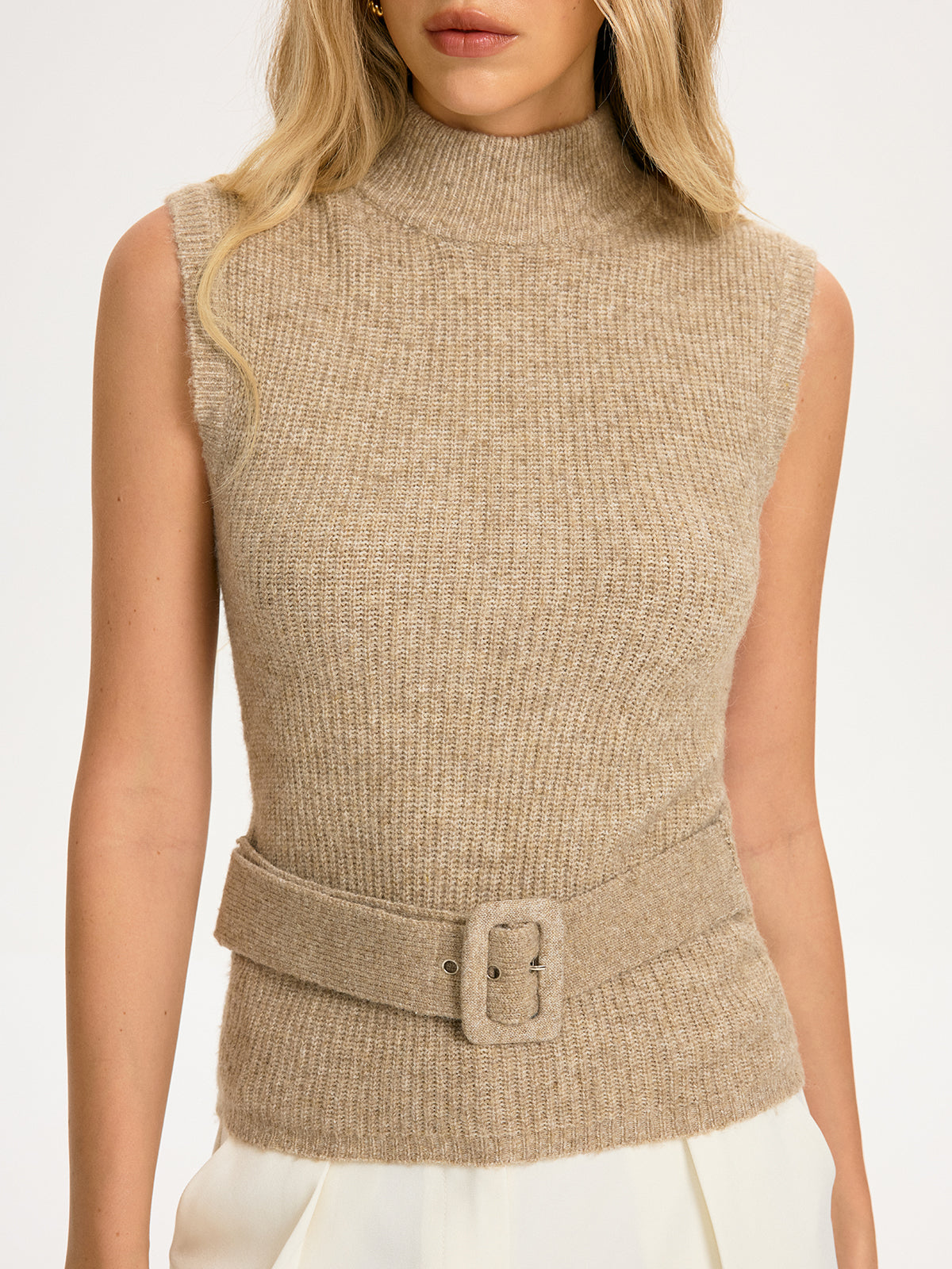 Belted Wool-Blend Sleeveless Turtleneck Knit Top