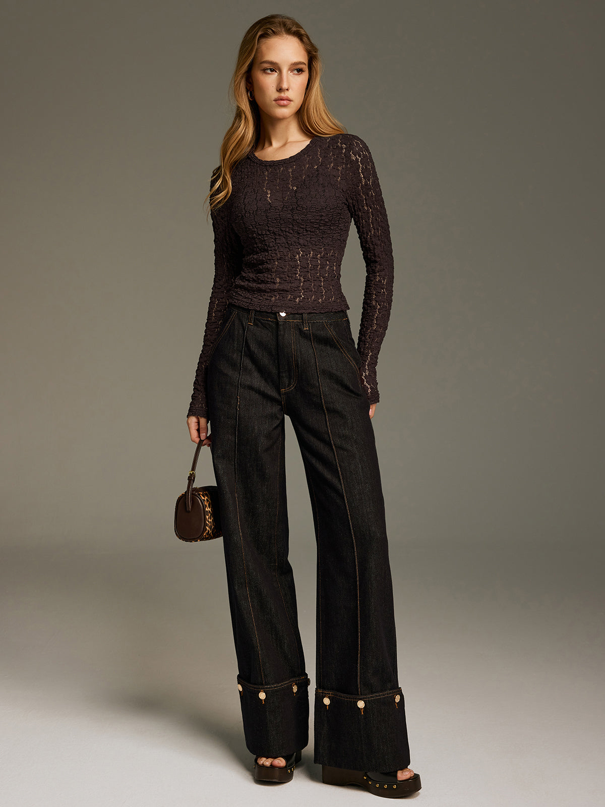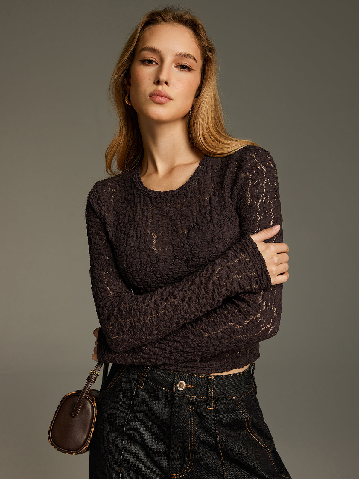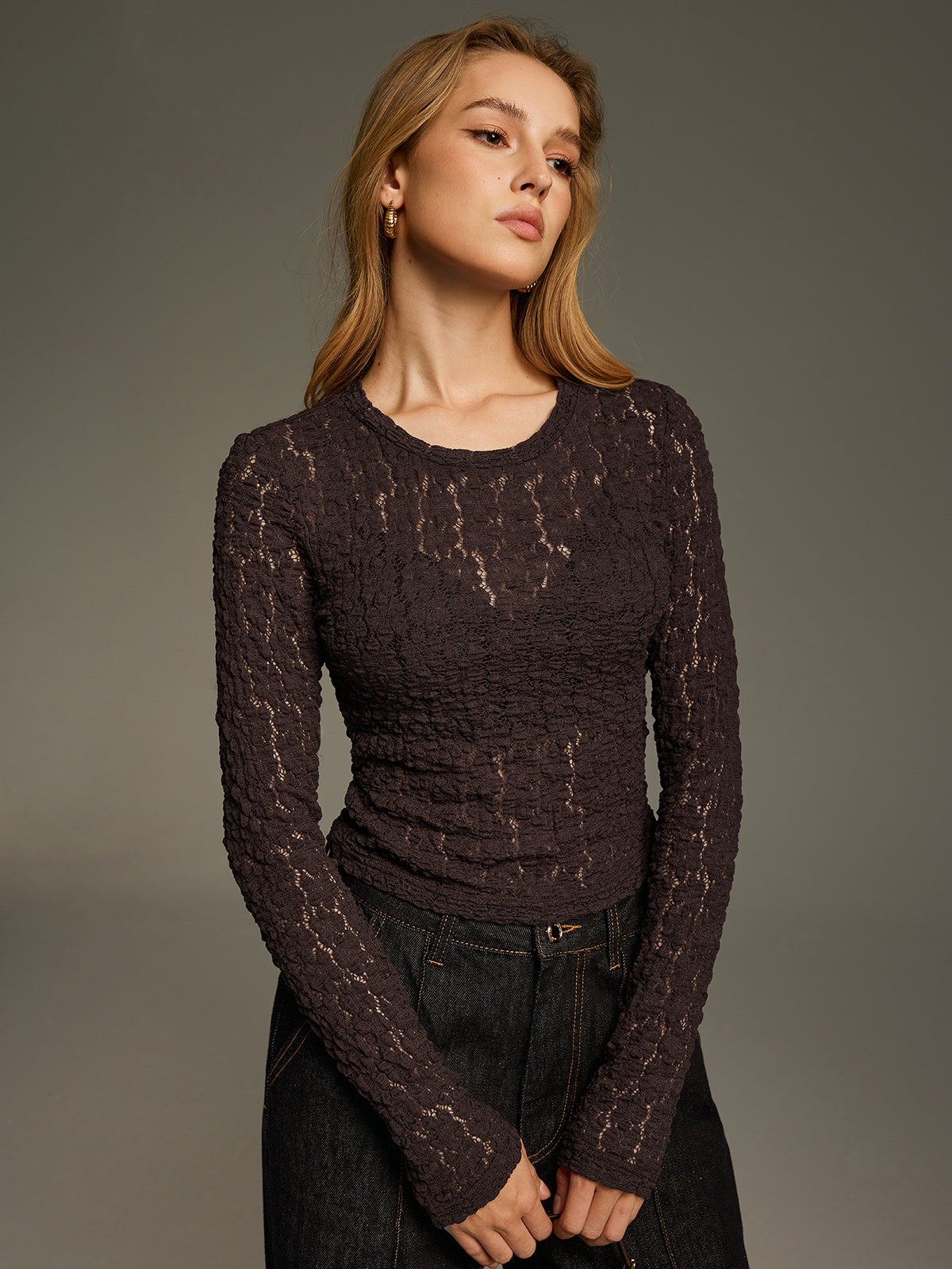 a-none,blouses,clothing,coll:blouses_shirts,coll:tops,crew neck,dark brown,fall,high stretch,in_six_month,lace,long sleeve,minegence,not_low_sales,oa251107101,photo_model,regular,slim fit,spring,thin,tops,winter,women,yes