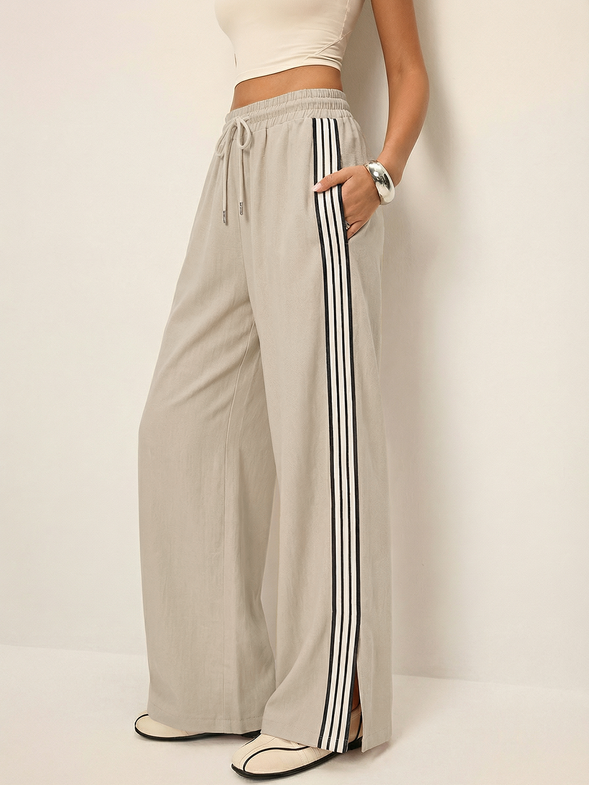 Cotton Linen Striped Split Drawstring Pants