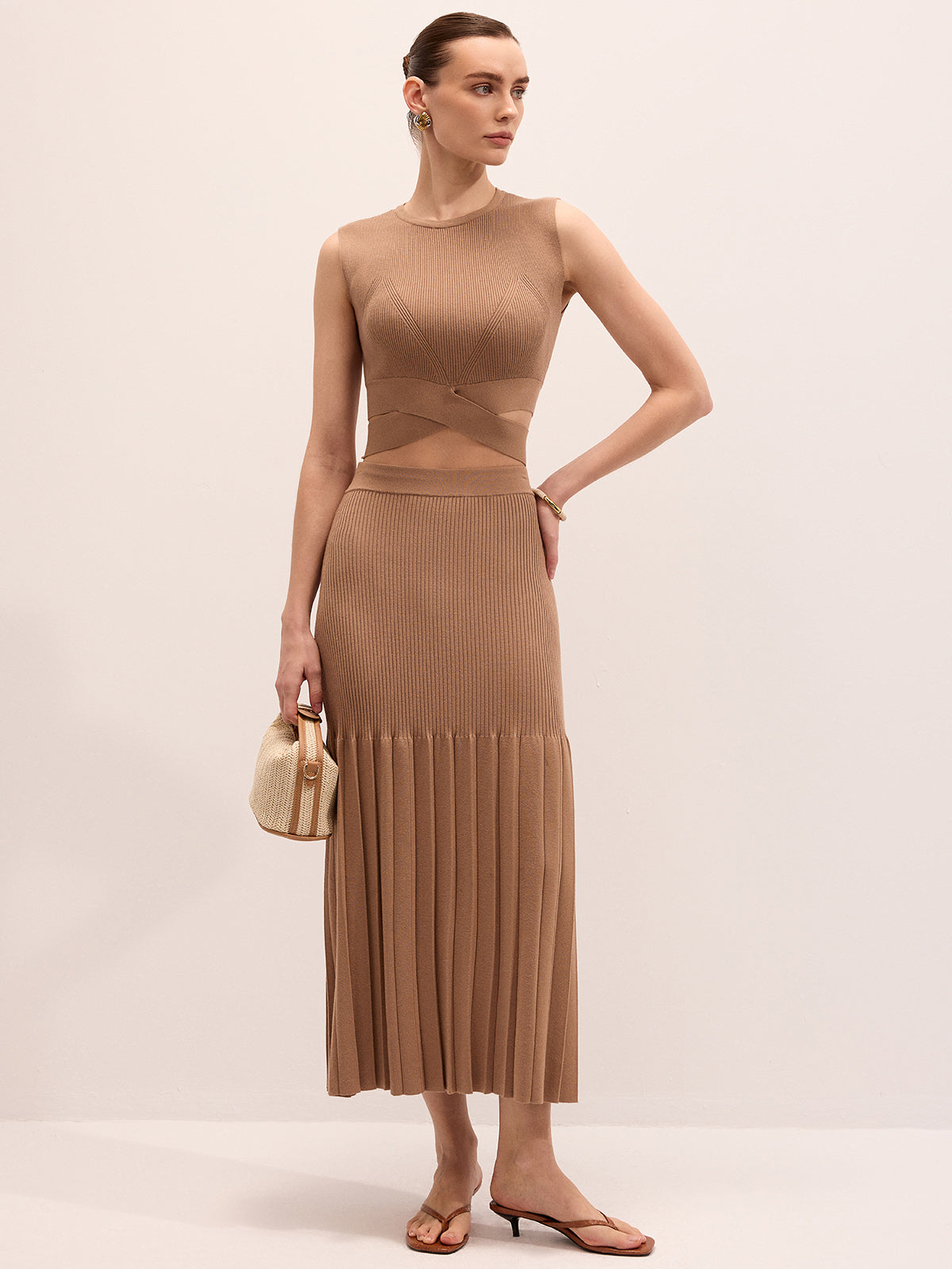Cut-Out Knit Top & Pleated Midi Skirt Set