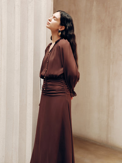 casual,chiffon,clothing,coll:dresses,dark brown,date,dresses,fall,feminine,in_six_month,inner sample,invisible zipper,long sleeve,maxi,metal detail,no,non-stretch,not_low_sales,oa250823007,photo_model,regular,regular fit,spring,thin,v-neck,winter,women